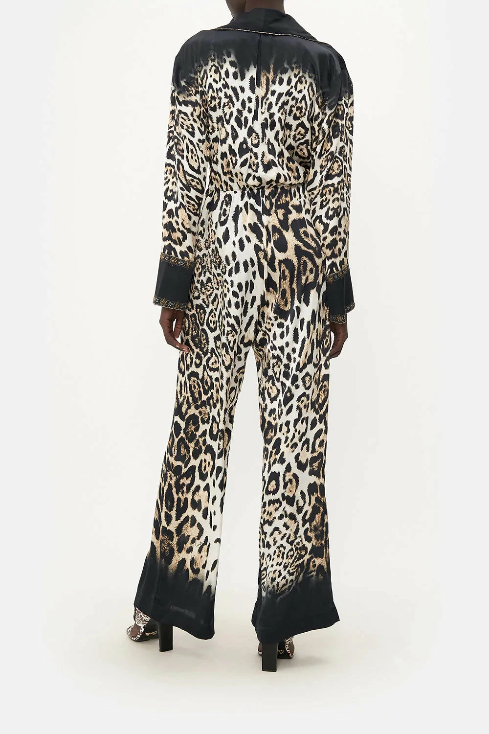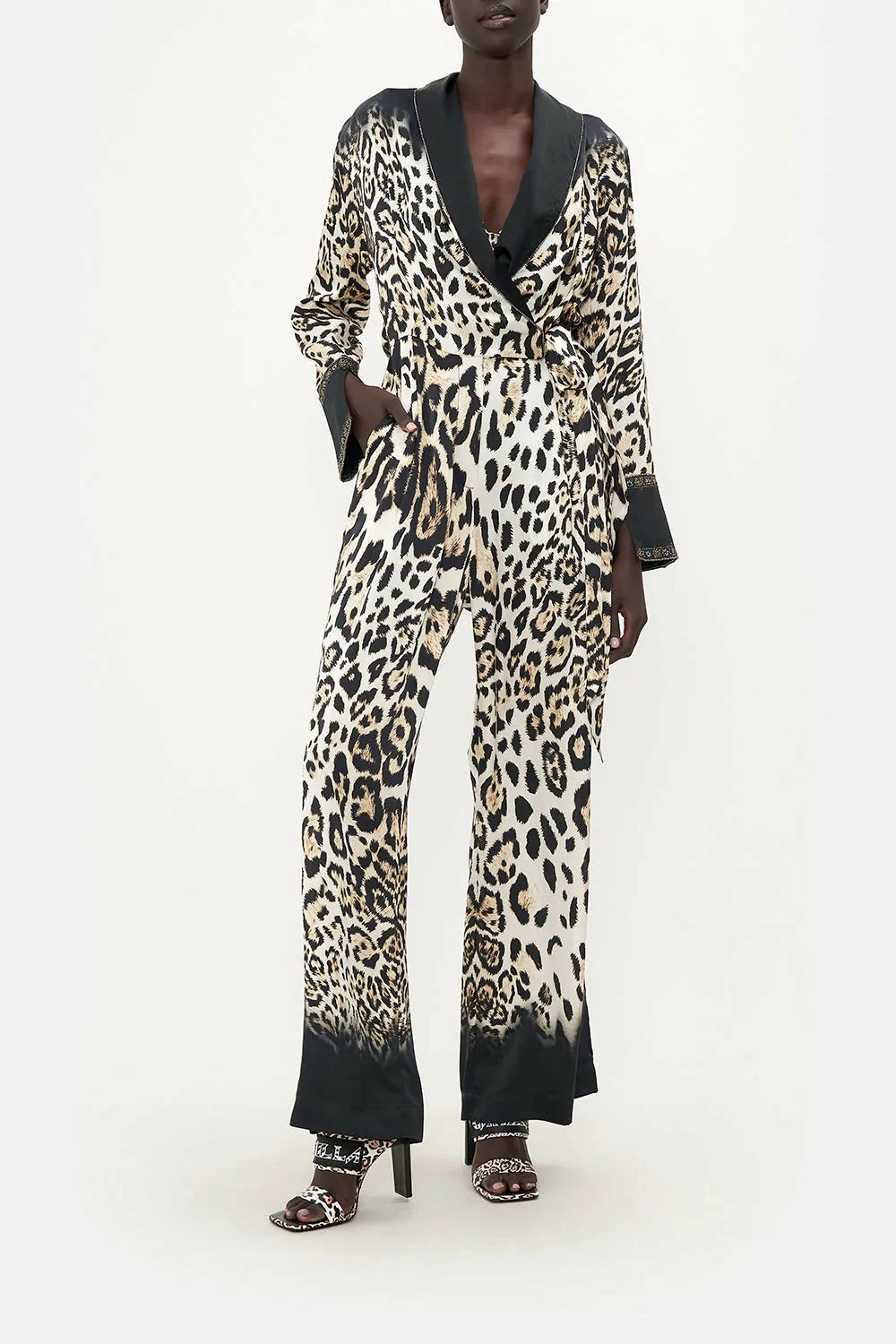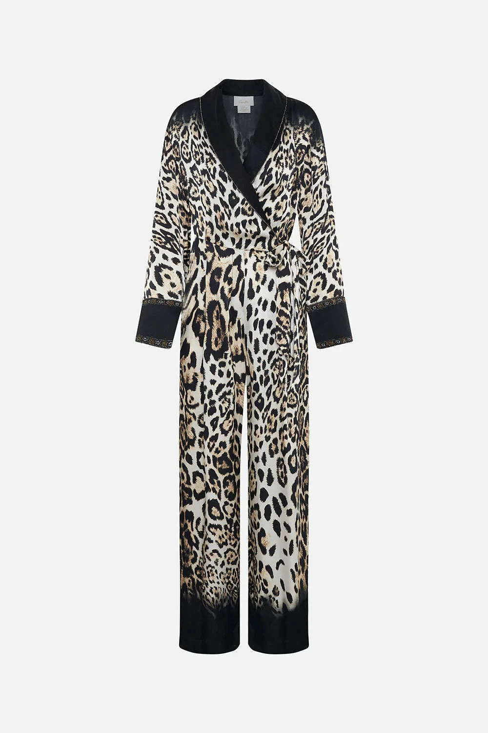 The Cool For Cats Pyjama Jumpsuit oozes seventies flair with timeless leopard print wrapped in sensational hues of ivory and mocha alongside eclipsing moments of cream and midnight. Crafted from breathable silk, this luxury jumpsuit plays host to a tailored silhouette that falls into a wrap waist that cinches and shapes, a contrasting lapel and cuff detailed with hand-placed crystals and classic wide leg pants that dance at the ankles.