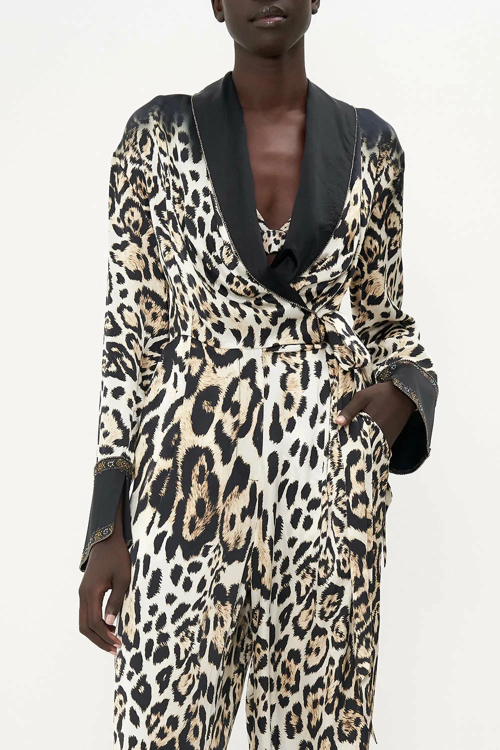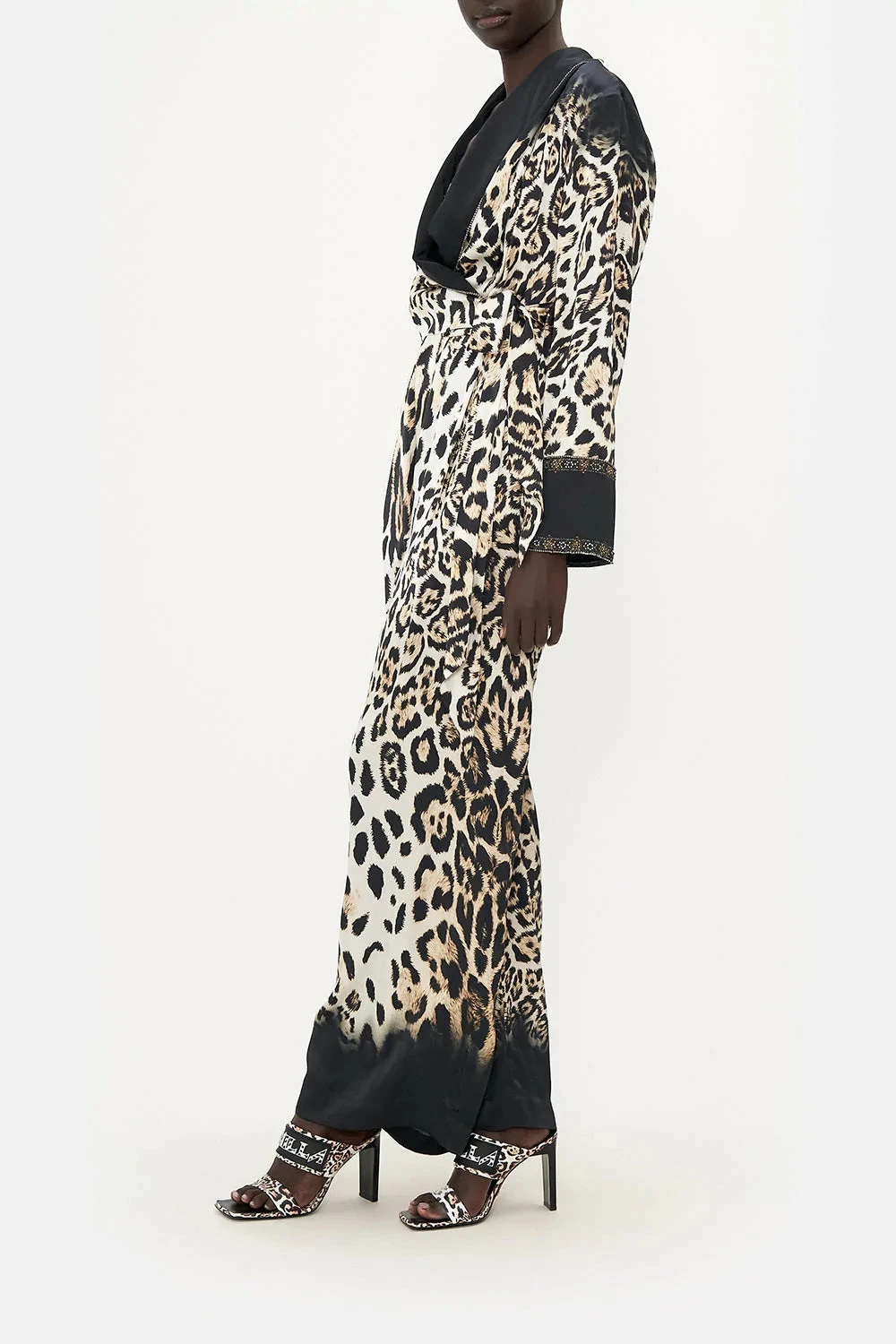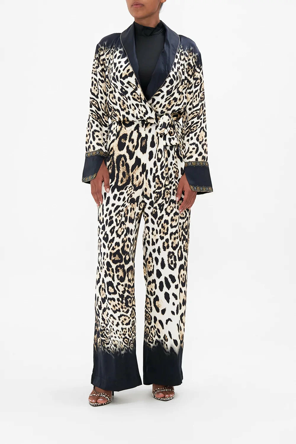 The Cool For Cats Pyjama Jumpsuit oozes seventies flair with timeless leopard print wrapped in sensational hues of ivory and mocha alongside eclipsing moments of cream and midnight. Crafted from breathable silk, this luxury jumpsuit plays host to a tailored silhouette that falls into a wrap waist that cinches and shapes, a contrasting lapel and cuff detailed with hand-placed crystals and classic wide leg pants that dance at the ankles.