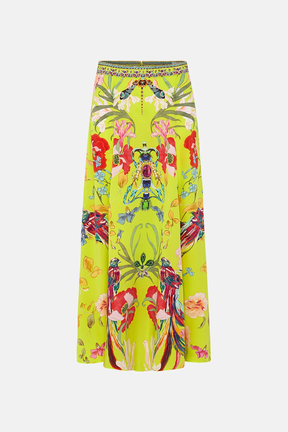 The Peacock Proud Panelled Flared Long Skirt greets the gaze with a lemon yellow dreamscape wrapped in sunset poppies, eclipsing golden vines that dance among blush-hued carnations and moments of intrigue with birds gracing cascades of sapphire petunias. Crafted from signature CAMILLA silk, this luxury maxi skirt plays host to a high-waist that cinches and shapes, a relaxed silhouette that dances by the feet, effortless zip fastening and hand-embellished crystals.