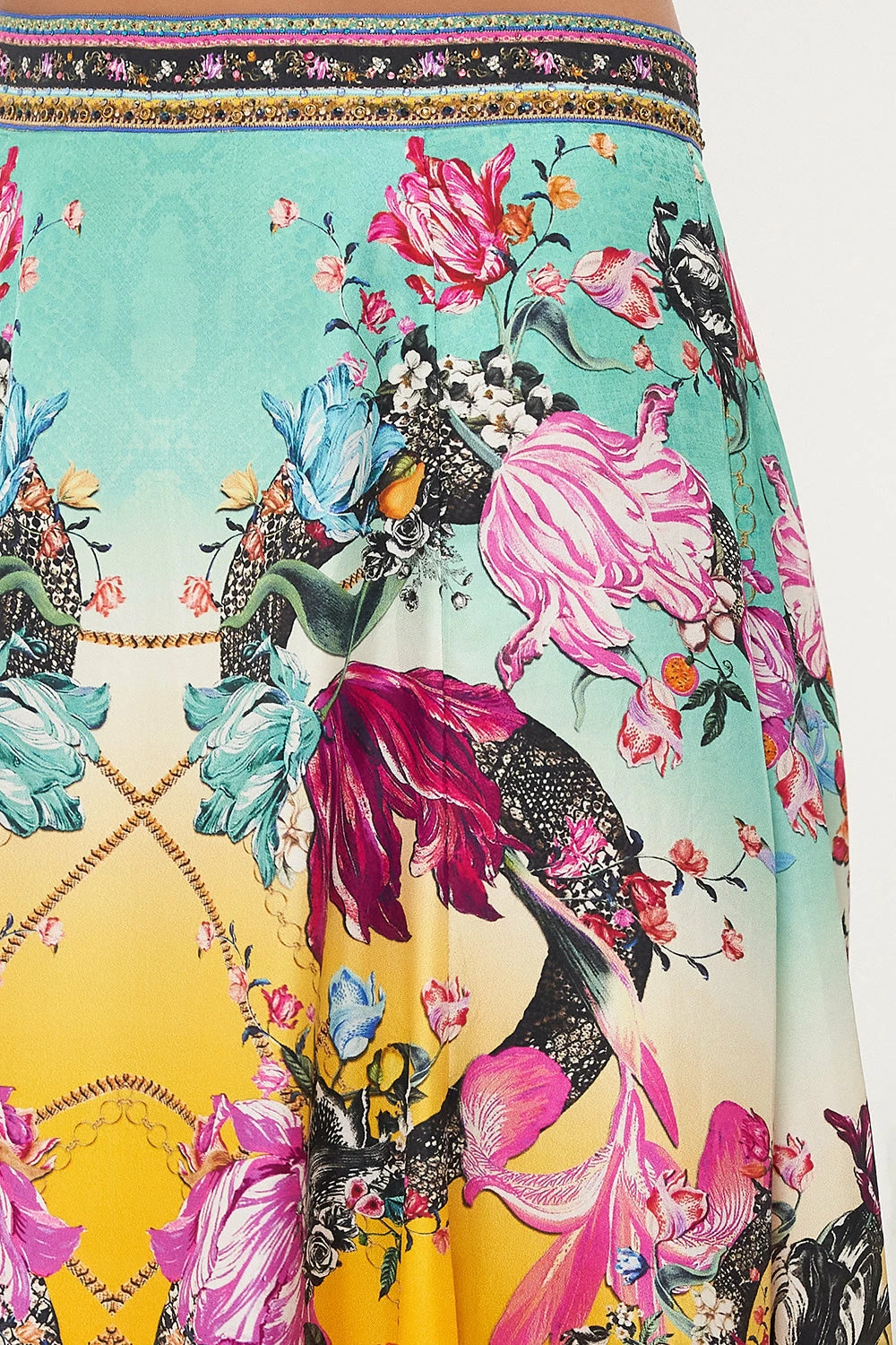 Gracing the eye with utter vibrancy, our Viper Room Panelled Flared Long Skirt captures a sea of teal and sunset tones adorning blush botanicals, gold chain indulgence and the fierce silhouette of the snake in rich hues. Finished with hand-embellished CAMILLA crystals, this luxury silk skirt plays host to a relaxed silhouette that falls into a midi hemline, a contrast panel trim and a semi-elasticated waist for your most perfect fit.