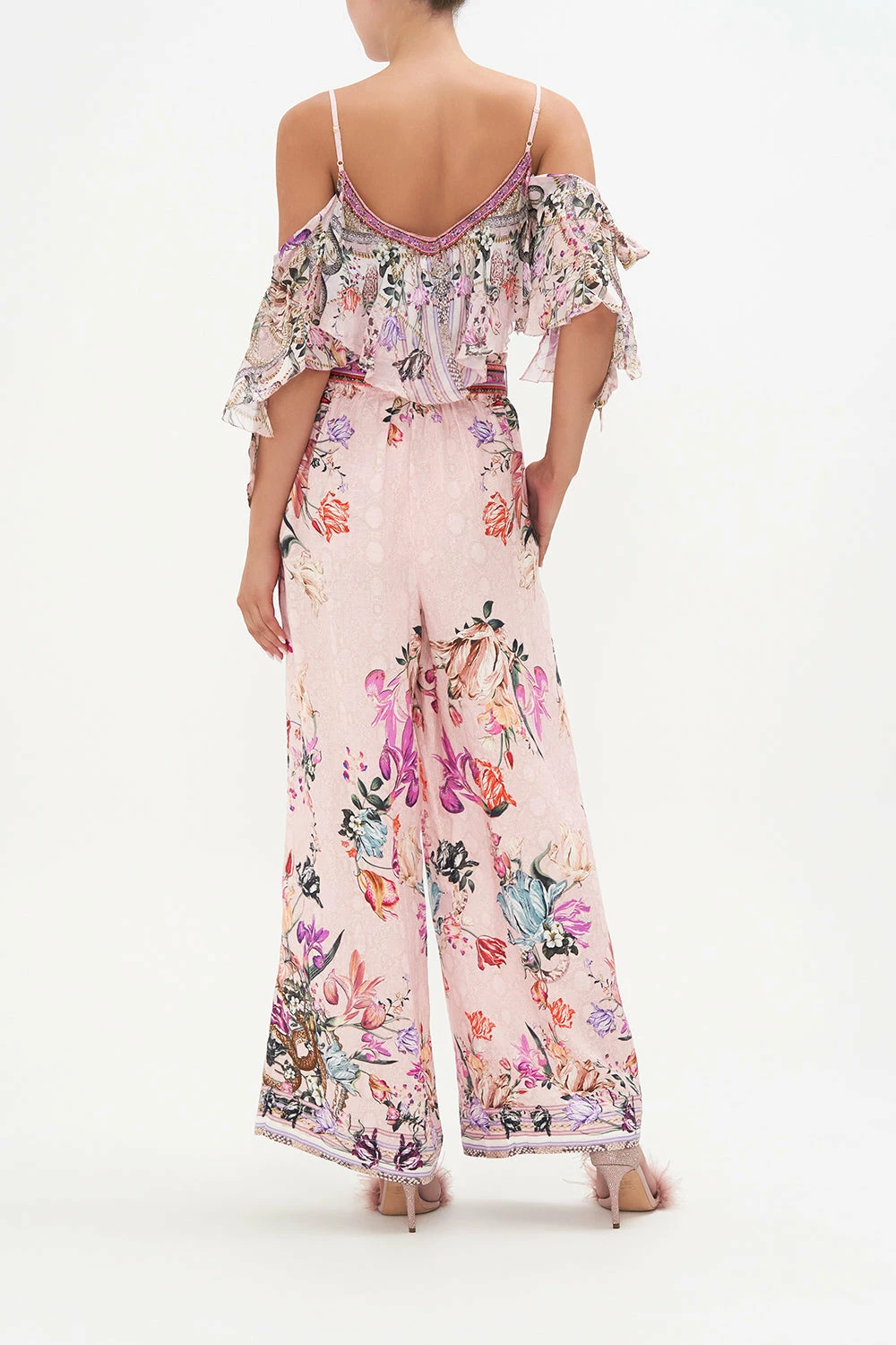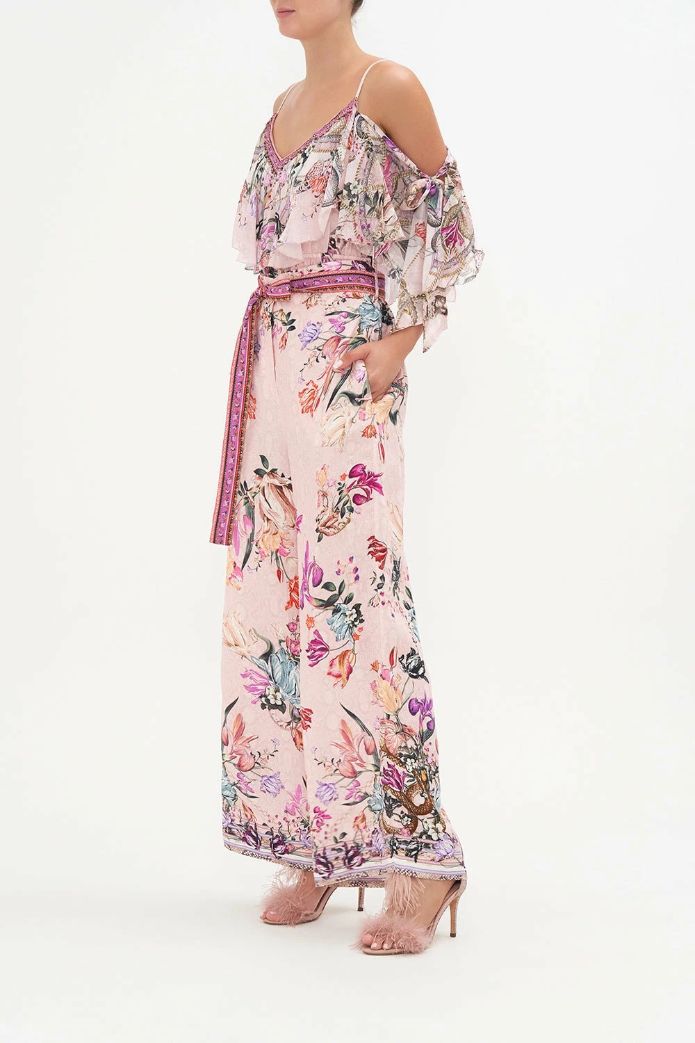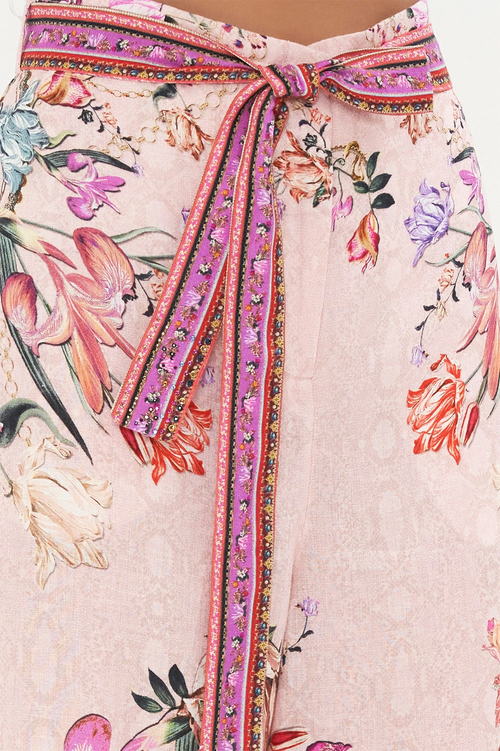 The summer palazzo elevated with the sweetness of flora, our Mad As A Snake Paperbag Waist Wide Leg Pant sports a soft dusty pink defined with cascades of striking snakes, botanicals in shades of sunset and gold chain details. Adorning hand-embellished crystals, this luxury linen pant features tie accents to cinch and shape, a statement wide leg, zip fastening and a gorgeously relaxed fit. Style with white sneakers for everyday chic or add the height of a heel for evening elevation.