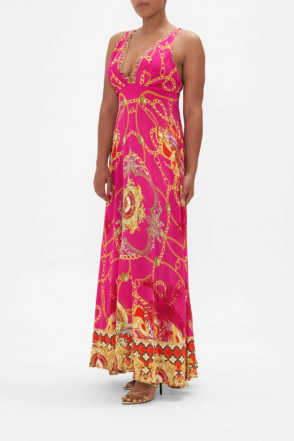 The Wild & Running Plunge Neck Maxi Dress evokes a striking palette of fuchsia, black and red. Sleek curved lines dance gracefully as monogrammed mosaics to create striking visual impact. Adorning hand-embellished CAMILLA crystals, this luxury maxi dress is finished with a decadently deep v neckline, a relaxed silhouette that falls into a flare hemline that dances at the feet and an open back accent that meets adjustable straps. Lovingly handcrafted and designed in Australia, explore more from The Moral Of The Story: Act II collection.