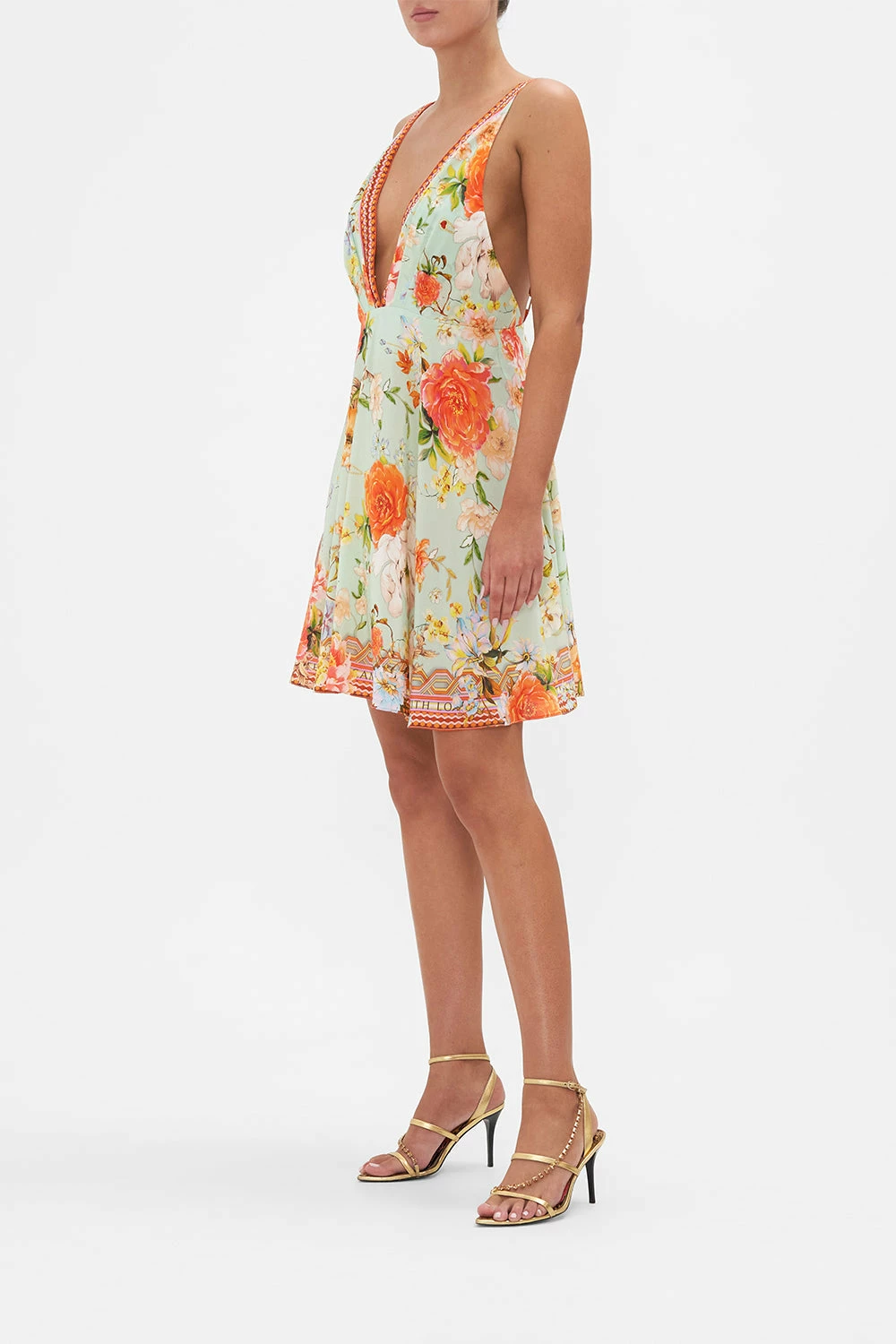 The Talk The Walk Plunge Neck Mini Dress is a sensual immersion of fragrant blooms. Subtle glimmers of hidden jewels and gilded flourishes dancing amongst a soft mint ambiance. Crafted from signature CAMILLA silk, this luxury mini dress plays host to hand-embellished crystals, a plunging neckline that meets contrast trims, an empire waistline and a relaxed silhouette that falls into a cropped hemline. Lovingly handcrafted and designed in Australia, explore more from The Moral Of The Story: Act II collection.