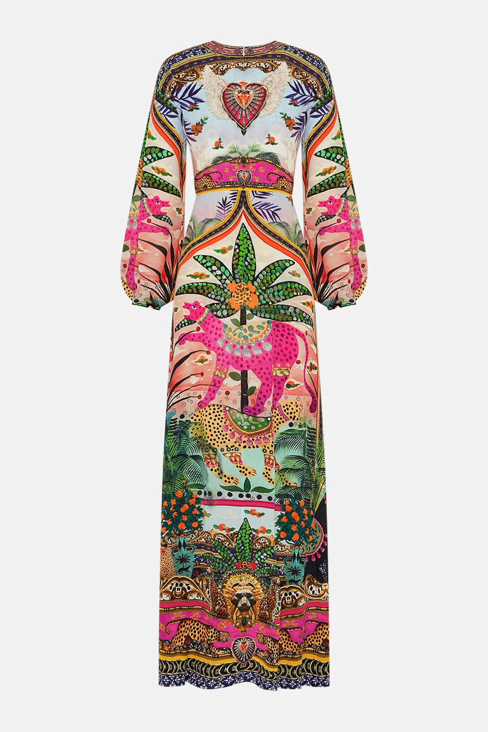 The Alessandro’s Atlantis Printed Lantern Sleeve Dress explores bold depictions of vibrant flora and fauna by artist Alessandro Florio. Artistic love letters to Mother Nature and her wild essence, that become heirloom stories handed down through generations. Epitomising dramatic elegance this luxury silk maxi dress is adorned with a plunging v neckline, softy billowy long lantern sleeves, a cinched in shaped waistband and flowy skirt that falls gracefully to full length. The ultimate in floaty dresses made for women who move through the world in style. Lovingly handcrafted, designed in Australia. Explore more from the Amore Mio collection.