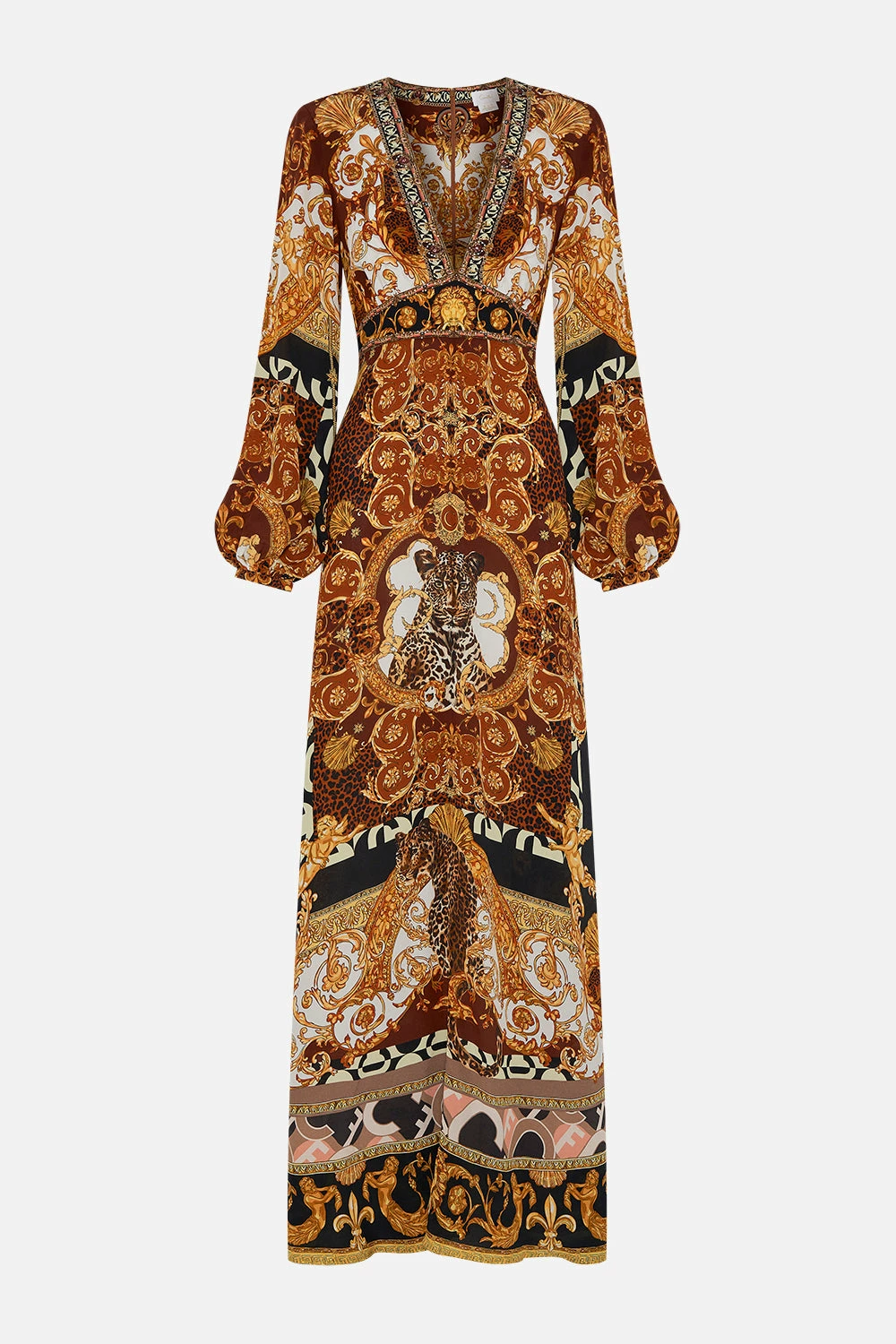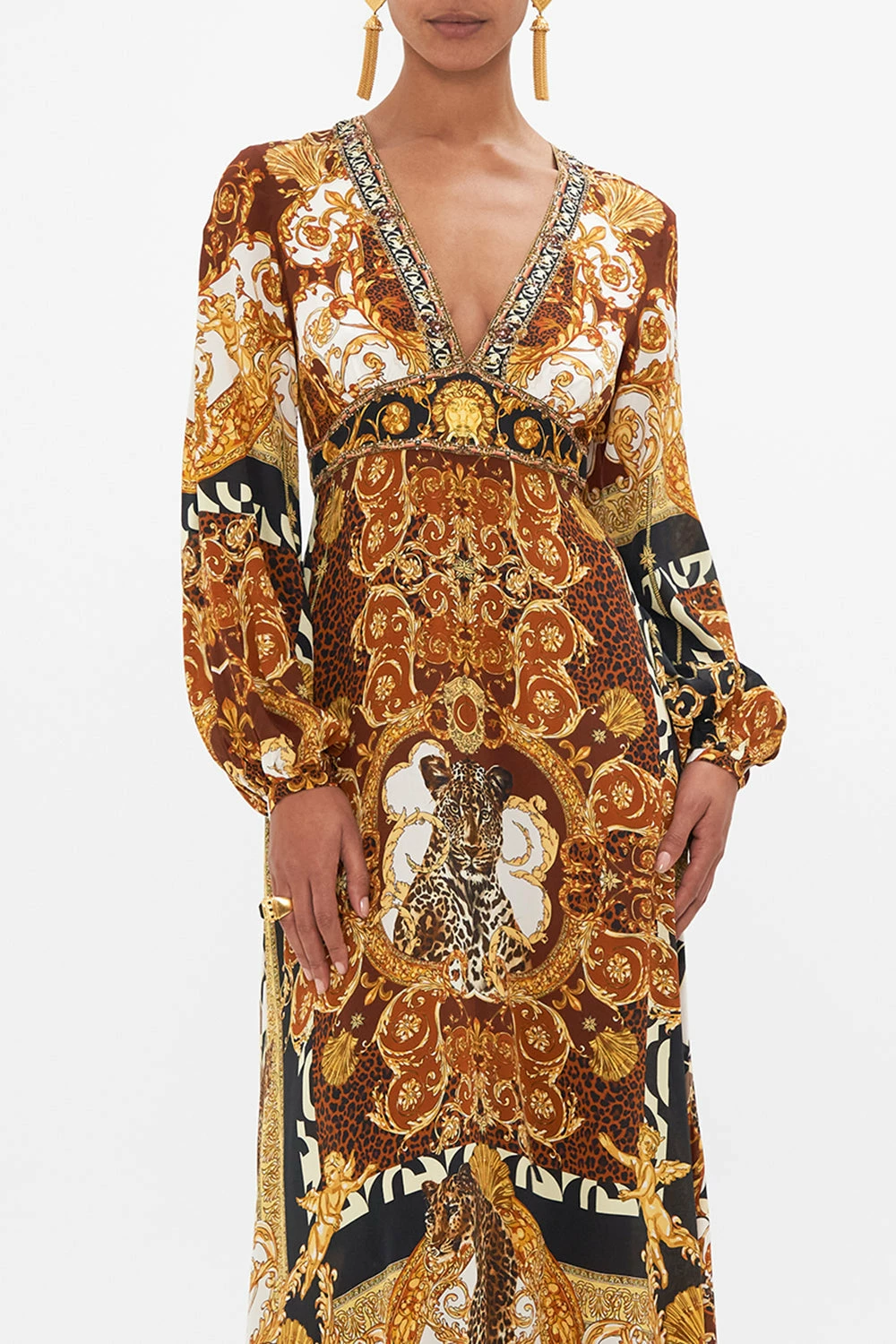 The Feeling Fresco Printed Lantern Sleeve Dress captures beautiful border prints entwined with feline moments reminiscent of vintage scarf motifs. Epitomising dramatic elegance this luxury silk maxi dress is adorned with a plunging v neckline, softy billowy long lantern sleeves, a cinched in shaped waistband and flowy skirt that falls gracefully to full length. The perfect formal dress for events that require a touch of opulence. Lovingly handcrafted, designed in Australia. Explore more from the Amore Mio collection.