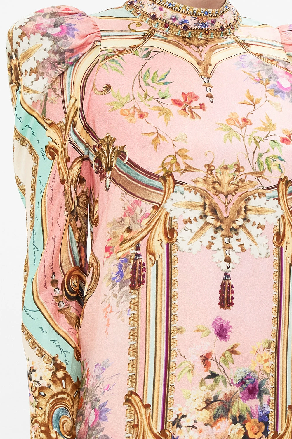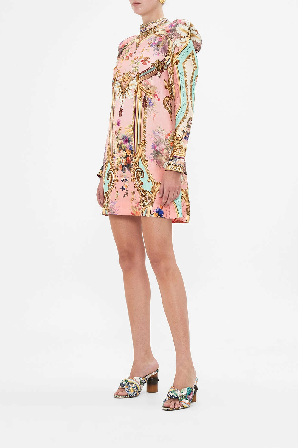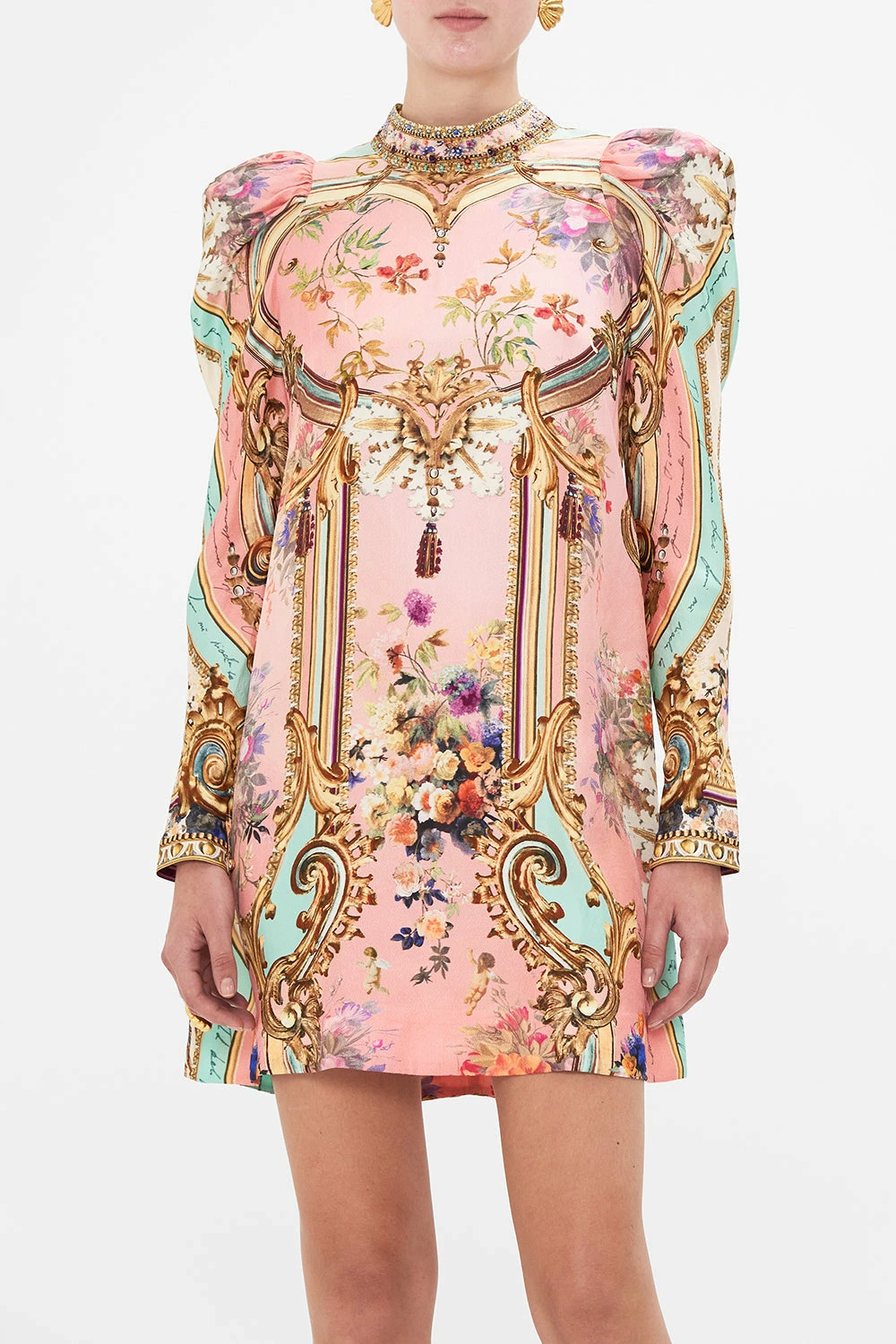 The Letters From The Pink Room Puff Sleeve High Neck Mini Dress depicts an atmosphere of soft pink with turquoise highlights amongst a world of pretty blooms and golden filigree. Crafted from signature silk, this luxury CAMILLA mini dress plays host to vivacious puff sleeves, elegant back cut out accent with button enclosure, finished with shimmering crystals throughout. A beautifully feminine floral party dress perfect for sun soaked days or starlit evenings. Lovingly handcrafted, designed in Australia. Explore more from the Amore Mio collection.
