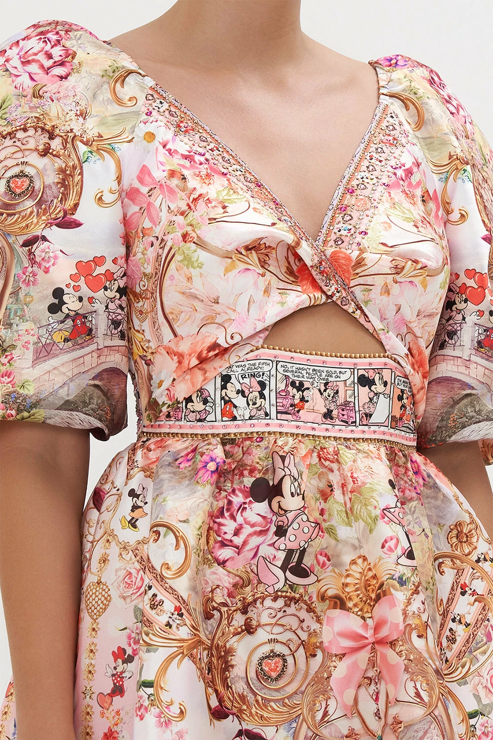 A limited edition treasure exclusive to our Disney | CAMILLA collaboration, the Minnie Mouse Magic Puff Sleeve Mini Dress is awash with a sea of gentle pinks that adorn Mickey and Minnie in all their magic, the soft flutter of butterflies amidst carnations and golden baroque detailing.