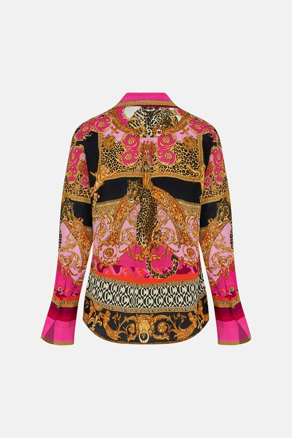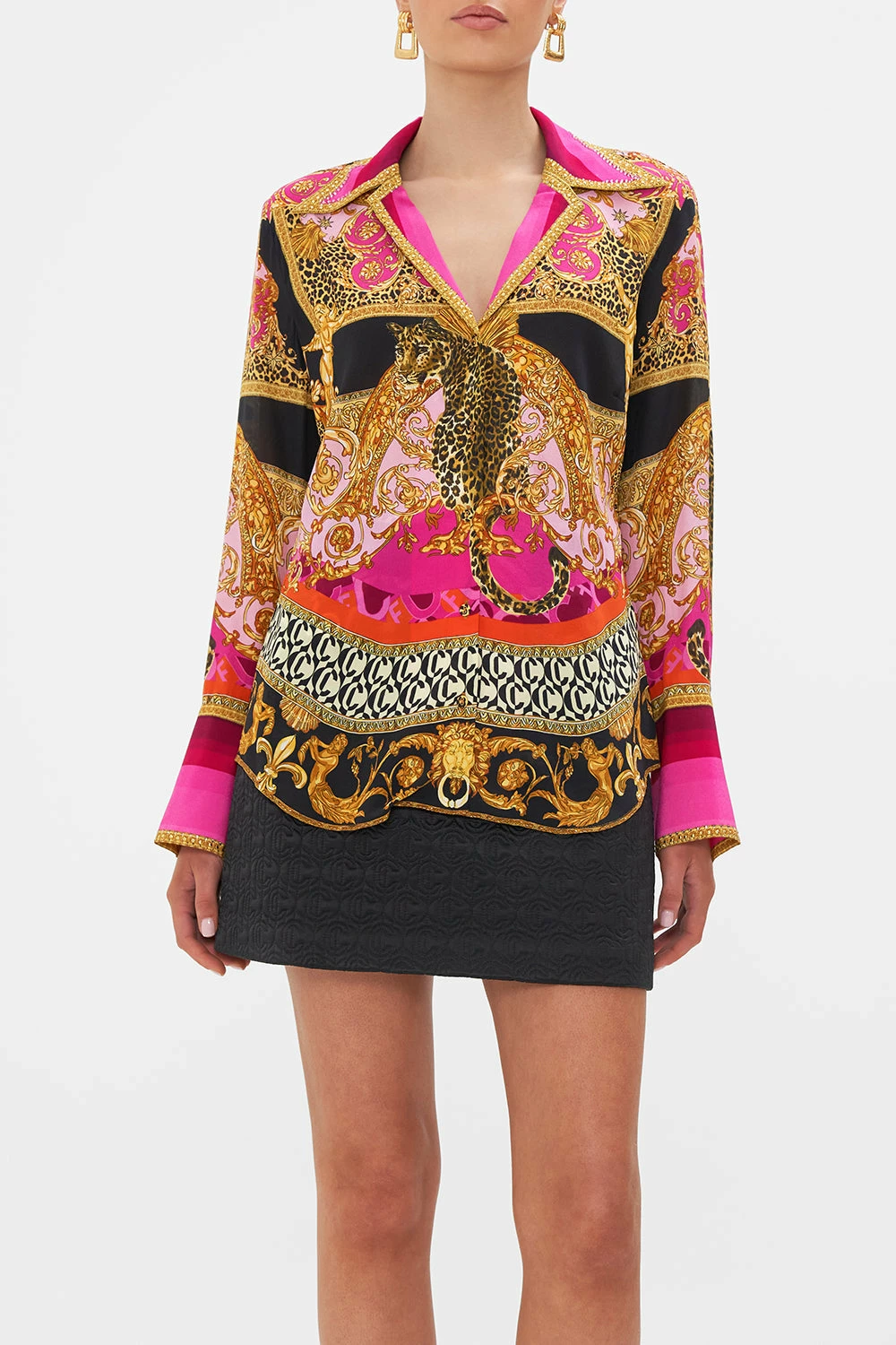 The Ciao Palazzo Pyjama Shirt captures beautiful border prints entwined with bright feline moments reminiscent of vintage Italian scarf motifs. This luxury CAMILLA silk printed shirt is home to a chic button through enclosure, soft lapel collar and sleek long sleeves with sumptuously wide split cuffs. Adorned with shimmering crystals for added shimmer and shine. A sleek yet slight oversized fit, perfect for french tucking into the matching Ciao Palazzo Lounge Pants or the Ciao Palazzo Flared Pocket Pant for polished perfection. Lovingly handcrafted, designed in Australia. Explore more from the Amore Mio collection.