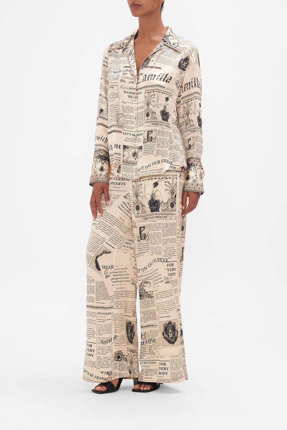 The Fame Fever Pyjama Shirt is an immersion of drama and audience captivating headlines set against soft sepia tones. Crafted from sensuously soft CAMILLA silk, this luxury pyjama shirt is home to a classic relaxed fit silhouette that adorns hand-embellished crystals, wide cuff details, open lapel collar and chic front button enclosure. Lovingly handcrafted and designed in Australia, explore more from The Moral Of The Story: Act II collection.
