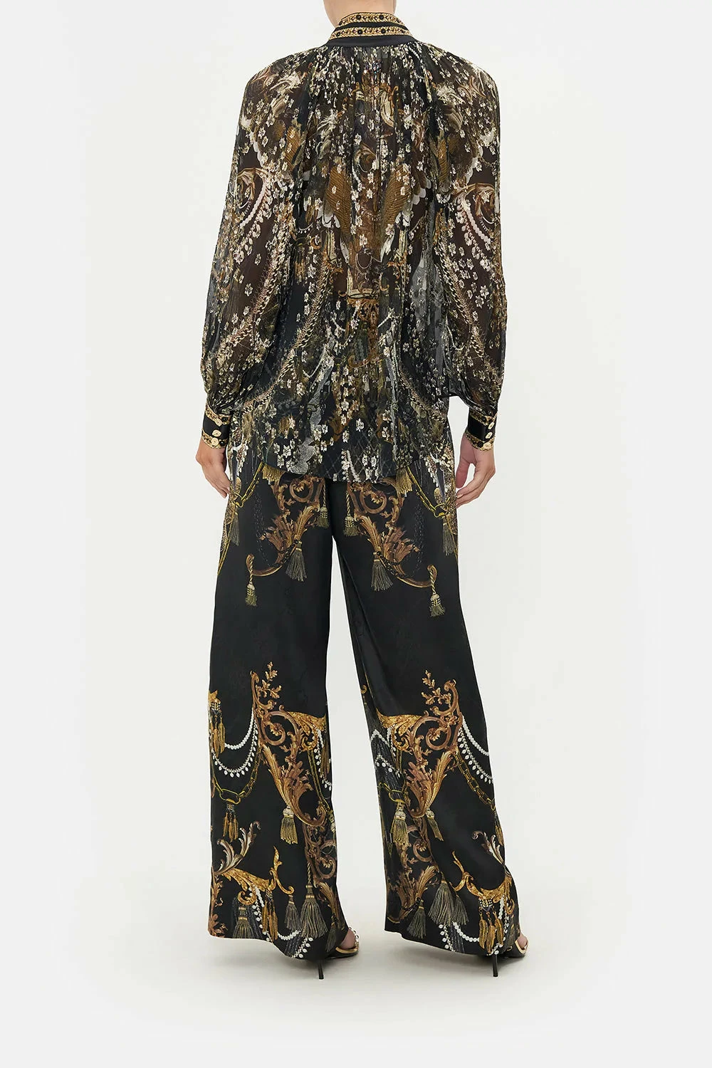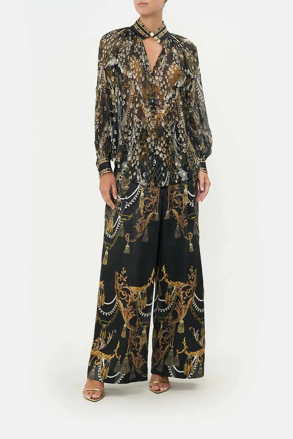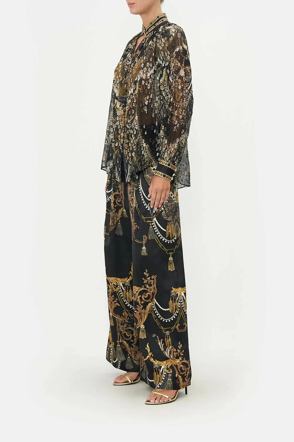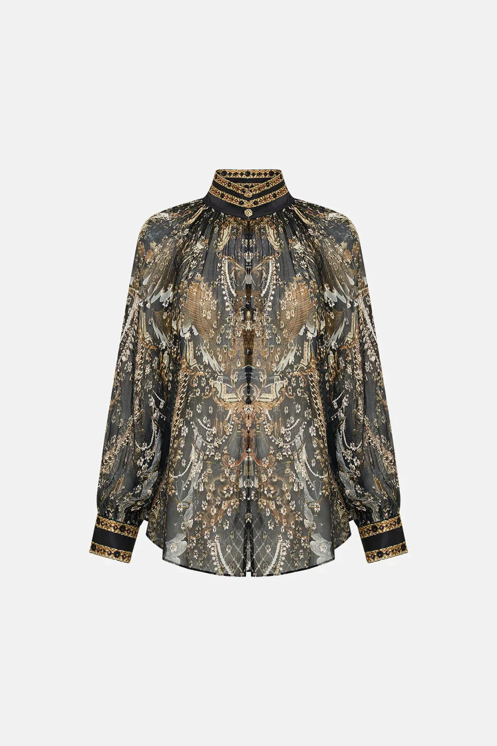 The Ravin Raven Raglan Button Up Shirt is immersed in golden raven wingtips soaring amidst bronze baroque details, cascades of chain rivers and the delicate touch of shimmery splashes that scintillate throughout. Crafted with crystal adornments, this luxury silk blouse plays host to a hand-embellished collar that melts into billowy blouson sleeves, tapered cuffs echoing golden hardware and a softly relaxed silhouette that falls into flared hemline.