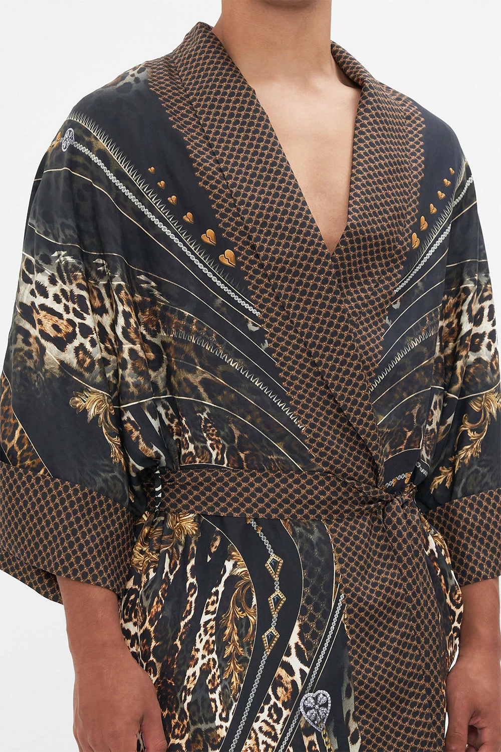 The Chaos In The Cosmos Reversible Mid Length Robe takes a journey along winding paths laced in lavish leopard accentuated with intricate strands of chain and charms. Crafted from lavish silk, this luxury robe features a detachable waist-tie, wide statement sleeves, side seam splits and a relaxed longline silhouette. Lovingly handcrafted, designed in Australia, explore more from The Moral Of The Story: Act II collection.