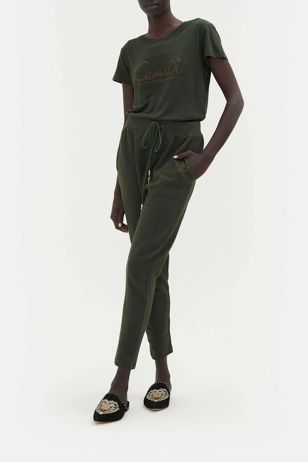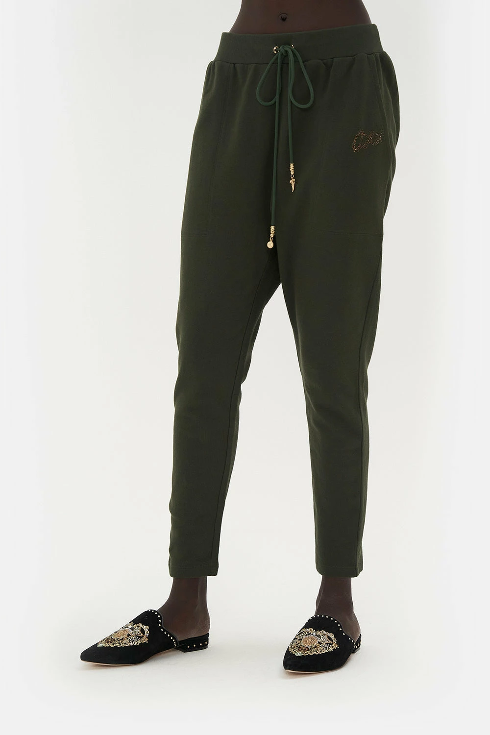 A loving ode to the hues of Pachamama and her highest feats, the Passport To Paradise Rib Waist Relaxed Pant dips into a deep khaki defined by the gold of our signature CAMILLA hardware. Crafted from breathable cotton, this luxury pant features a high-rise cut to frame the waist, a tapered fit, pocket functionality, tassel detailing and a relaxed silhouette that falls into a straight leg.