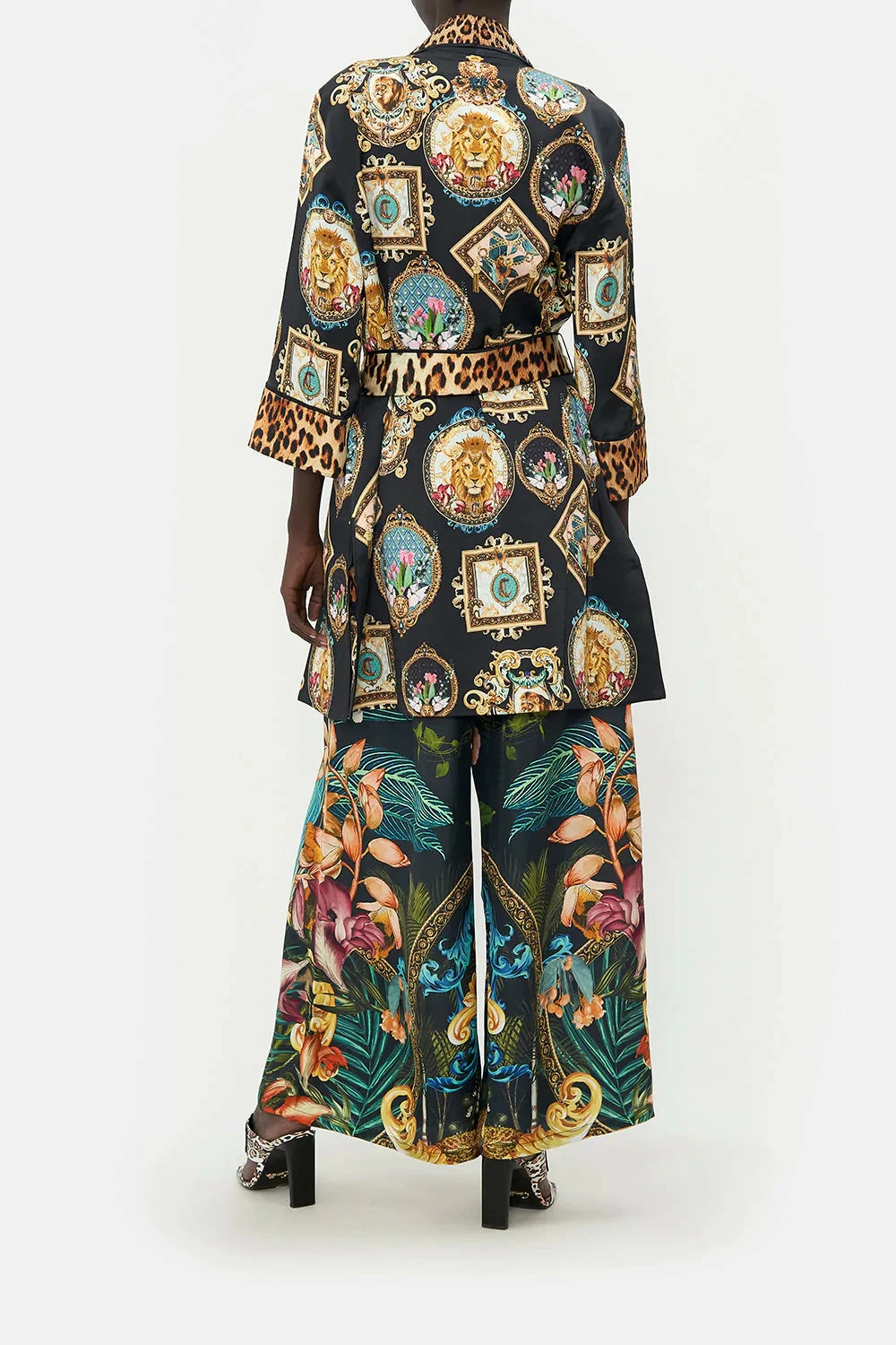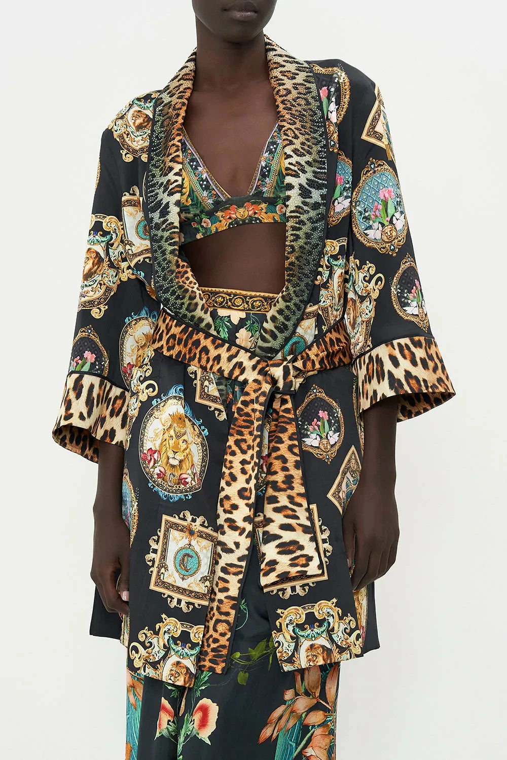 The Fearless Felis Roll Collar Pyjama Jacket wraps the gaze with a sea of rich midnight hues enveloped by baroque details, amulets of big cat majesties and soft botanical bouquets dipped in blush hues that bloom from golden mirrors. A true collector’s treasure, this luxury silk jacket adorns hand-embellished CAMILLA crystals, decadent piped trim, a contrasting waist-tie to cinch and shape and a relaxed silhouette that cuts at a midi hem.