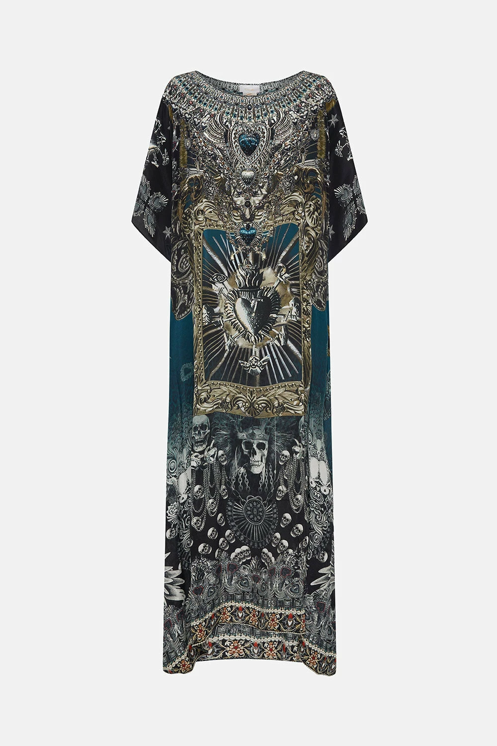 Signature resort wear encased in odes to Mexico, our Animal Anarchy Round Neck Kaftan is wrapped in a rich emerald leopard print adorning the intricacies of ivory skulls, metallic amulets and silver-dipped hearts. Complete with hand-embellished crystals, this luxury silk kaftan features a generous rounded neckline, cropped sleeves and a relaxed maxi silhouette. With so many , transform your kaftan into mini dresses, luxury layers, maxi skirts and shapes of Grecian proportions.