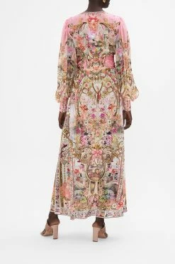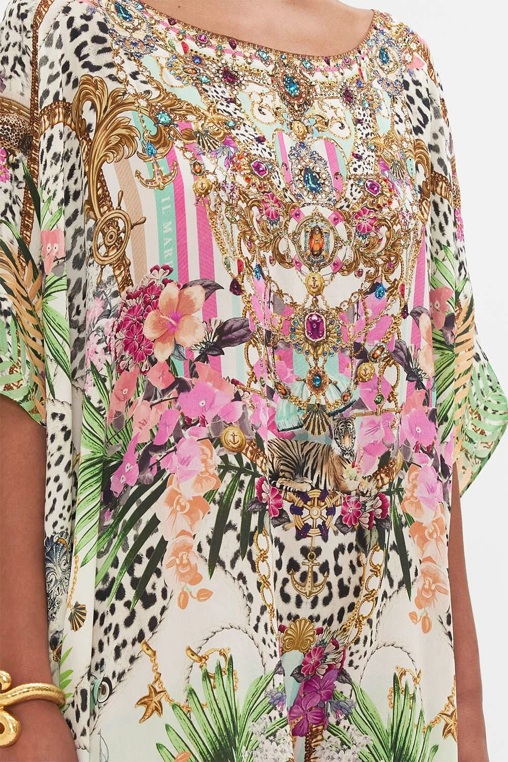 The Dear Amore Mio Round Neck Kaftan depicts a world of lush foliage and feline motifs dancing amongst golden arches. Adorned with signature CAMILLA crystals, this luxury silk kaftan is home to a generous rounded neckline, cropped sleeves and a relaxed maxi silhouette. Explore our to discover all the ways to wear this perennially perfect CAMILLA wardrobe staple. Wear as luxe resort wear or as a statement party dress. Lovingly handcrafted, designed in Australia. Explore more from the Amore Mio collection.