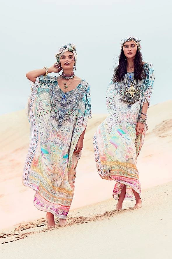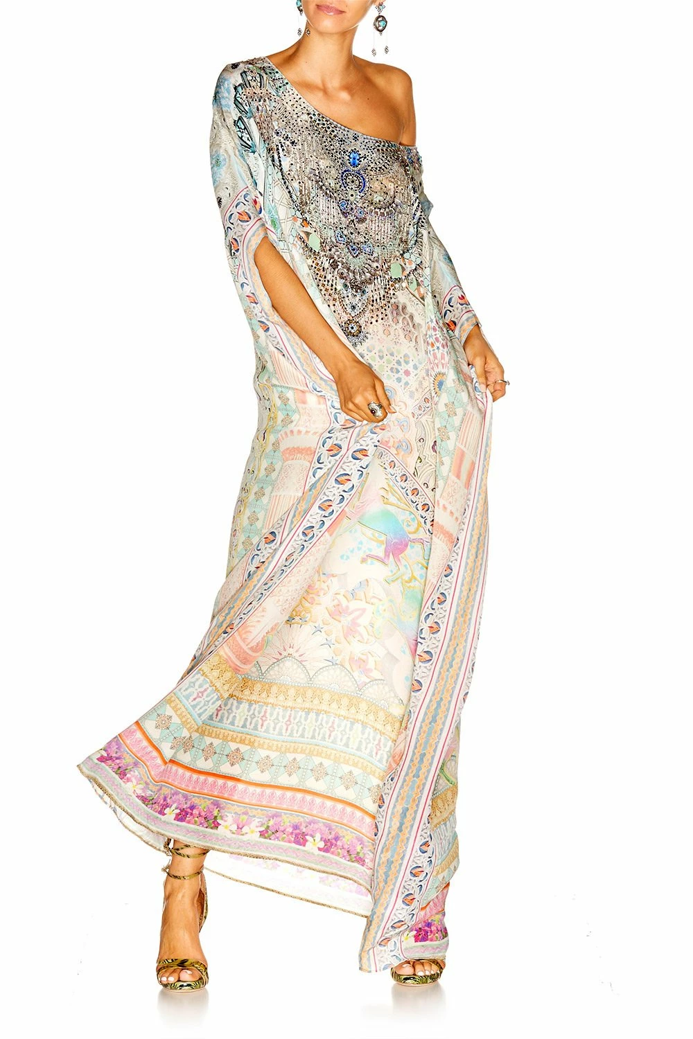 A signature CAMILLA style that will become a mainstay of your bohemian-inspired wardrobe, the Round Neck Kaftan in our exclusive Dear Diary print is an elegant multi-wear option that is cut from premium silk for maximum softness throughout the silhouette and against the skin. Adorned with hand-applied crystal embellishments to neckline, this staple style is inspired by the abounding tranquility of the Zhu family garden. Take advantage of the muli-wear capabilities of this kaftan and style as a fitted halter dress teamed with and a .