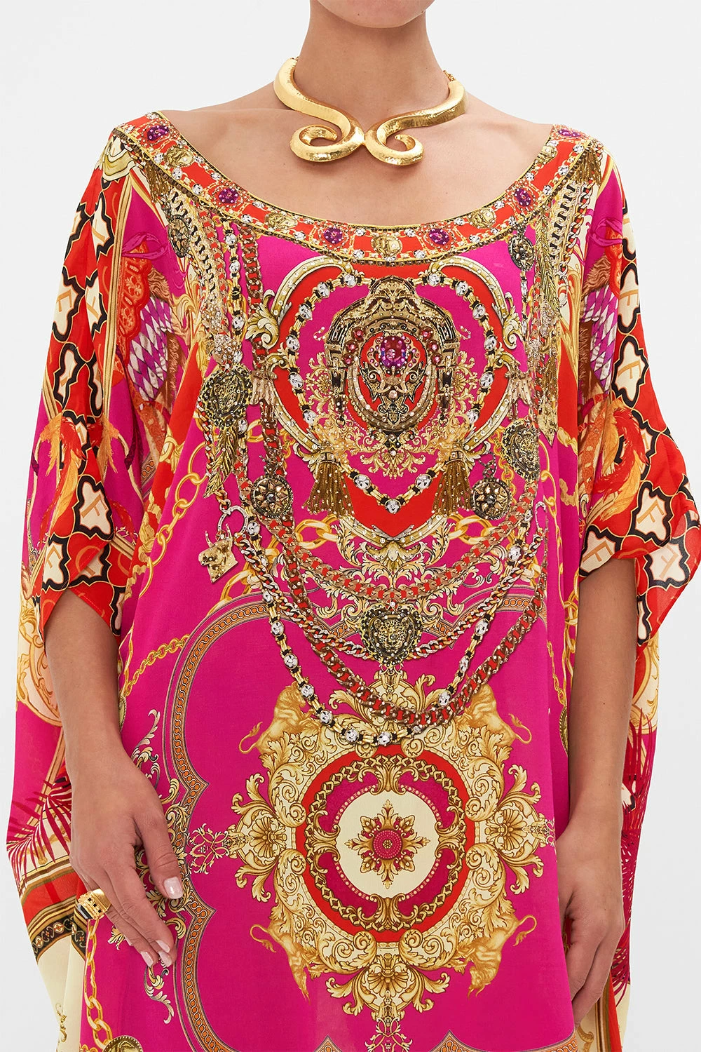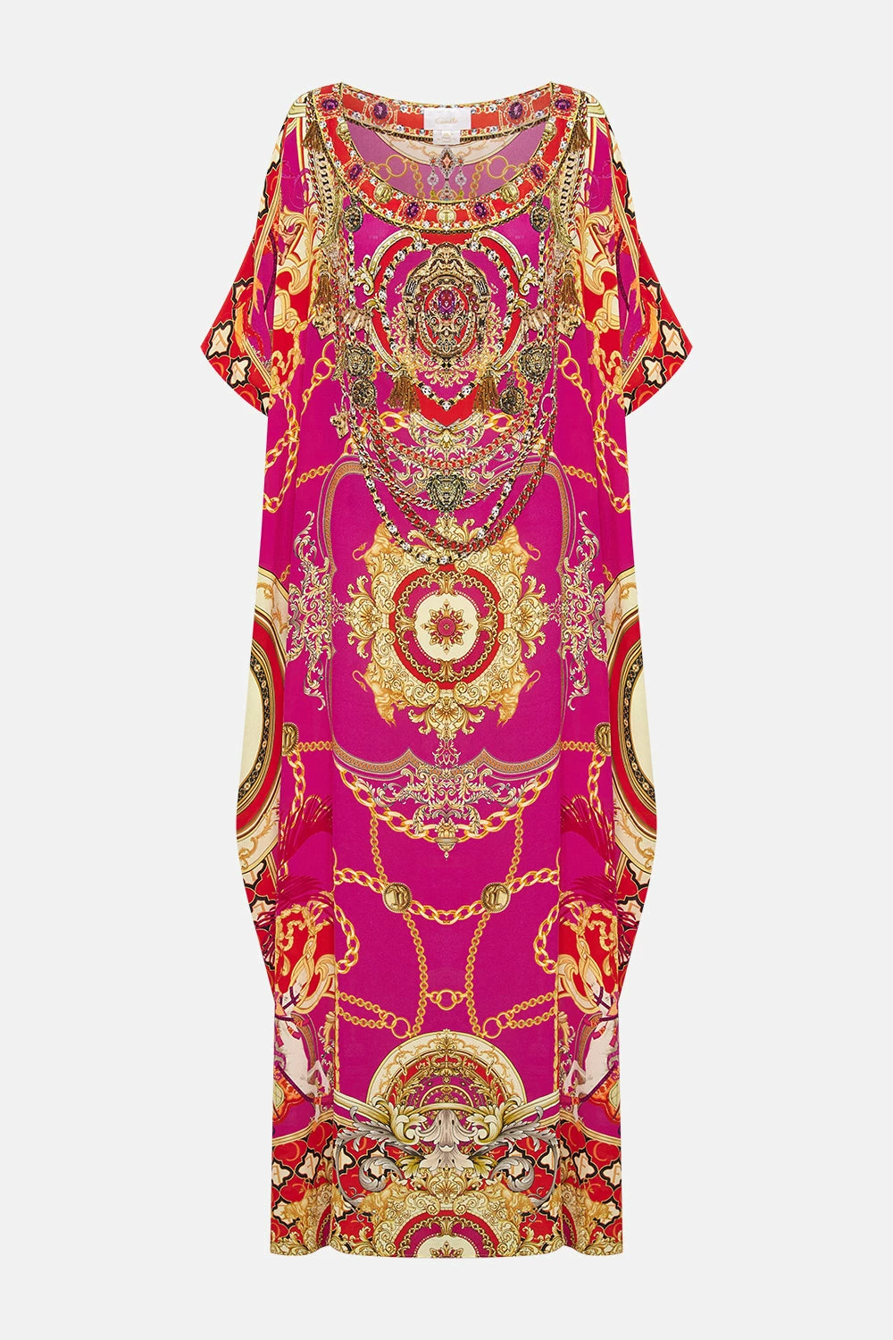 The Wild & Running Round Neck Kaftan evokes a striking palette of fuchsia and red. Sleek curved lines dance gracefully within bold mosaic borders, golden flourishes entwine with fronds of scarlet palms and decadent layers of glistening gold chains. Adorned with hand-embellished crystals, this luxury silk kaftan is home to a generous rounded neckline, cropped sleeves and a relaxed maxi silhouette. Explore our style guide to discover all the ways to wear this perennially perfect CAMILLA wardrobe staple. Lovingly handcrafted and designed in Australia, explore more from The Moral Of The Story: Act II collection.