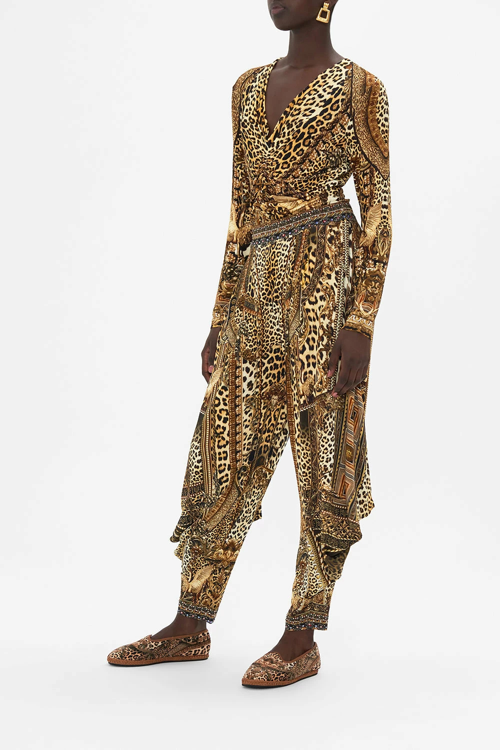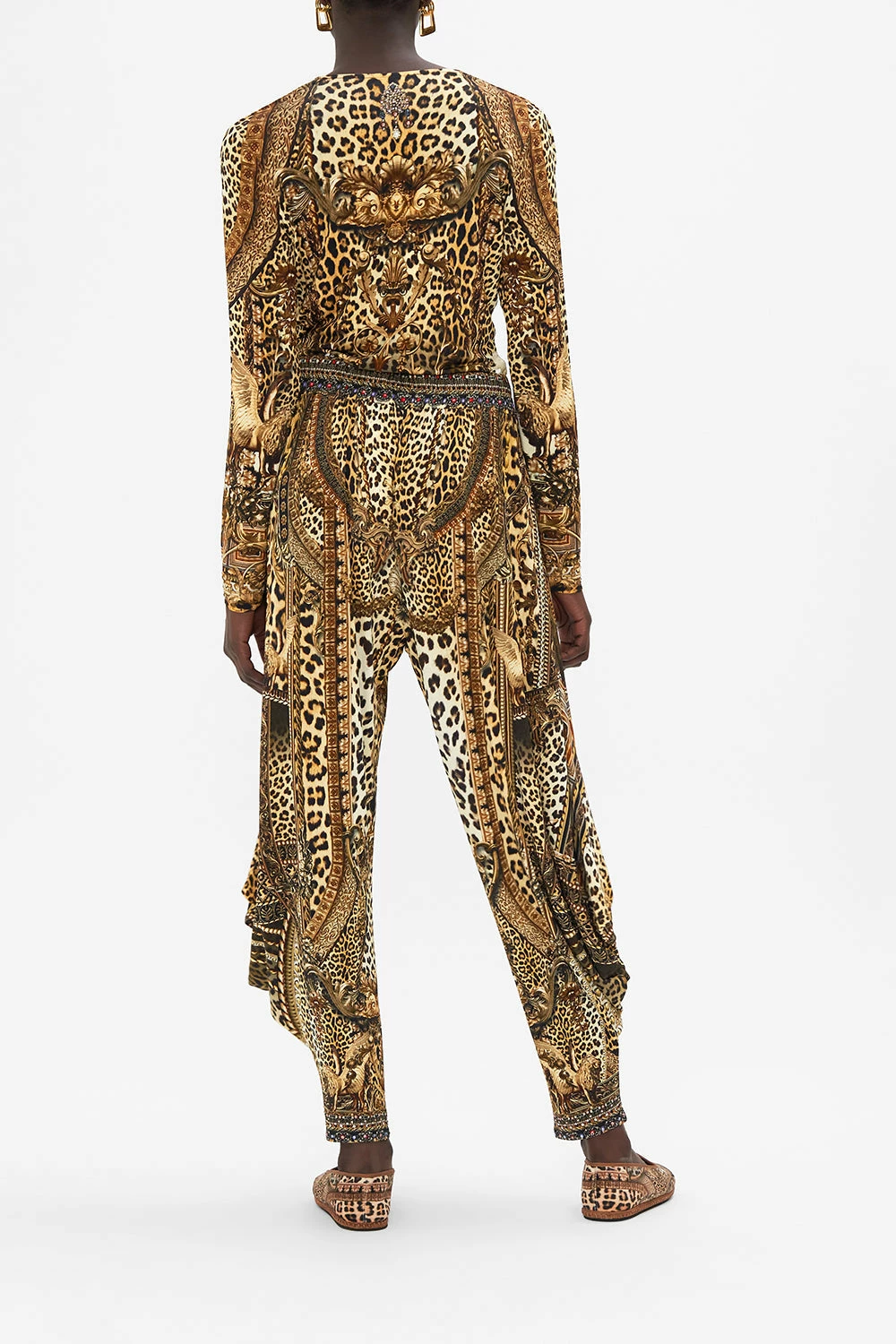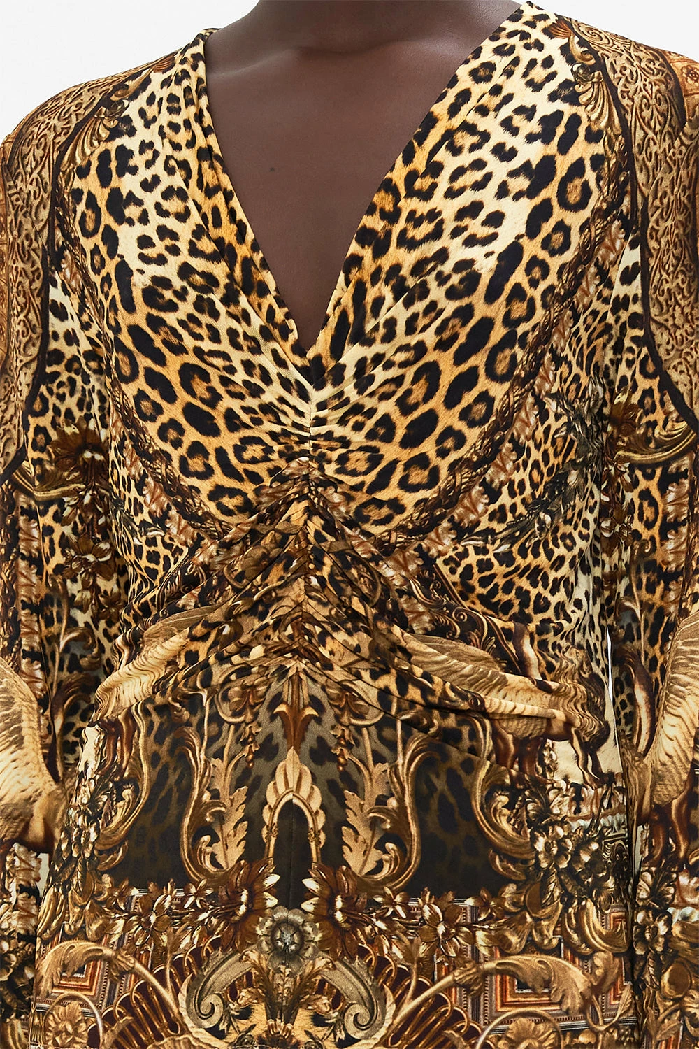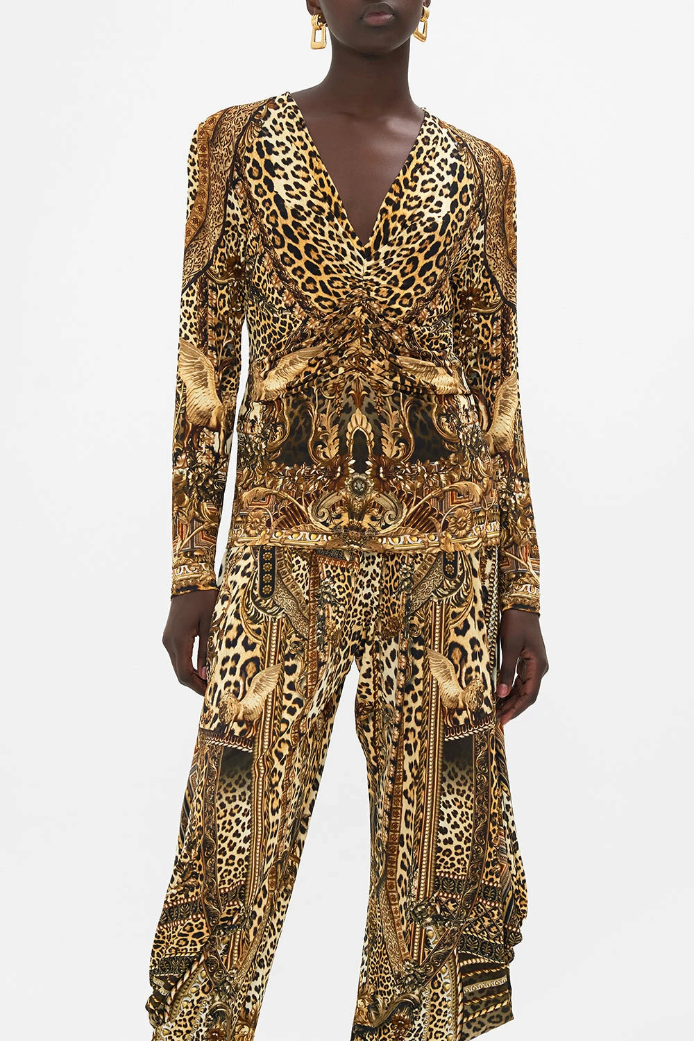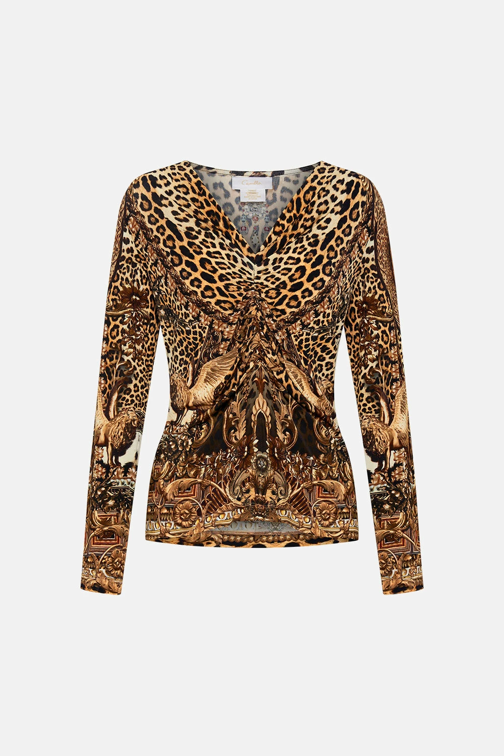 The Standing Ovation Ruched Long Sleeve Jersey Top captures the unbridle inspirational spirit of the infamous Teatro alla Scala through a rhapsody of rich leopard print. Adorning CAMILLA crystals, this luxury v neck top features full length sleeves, adjustable ties and sleek fitting silhouette that falls effortlessly to the hip. Pair with the Standing Ovation Jersey Drape Pant With Pocket for chic co-ord styling. Lovingly handcrafted, designed in Australia. Explore more from the Amore Mio collection.