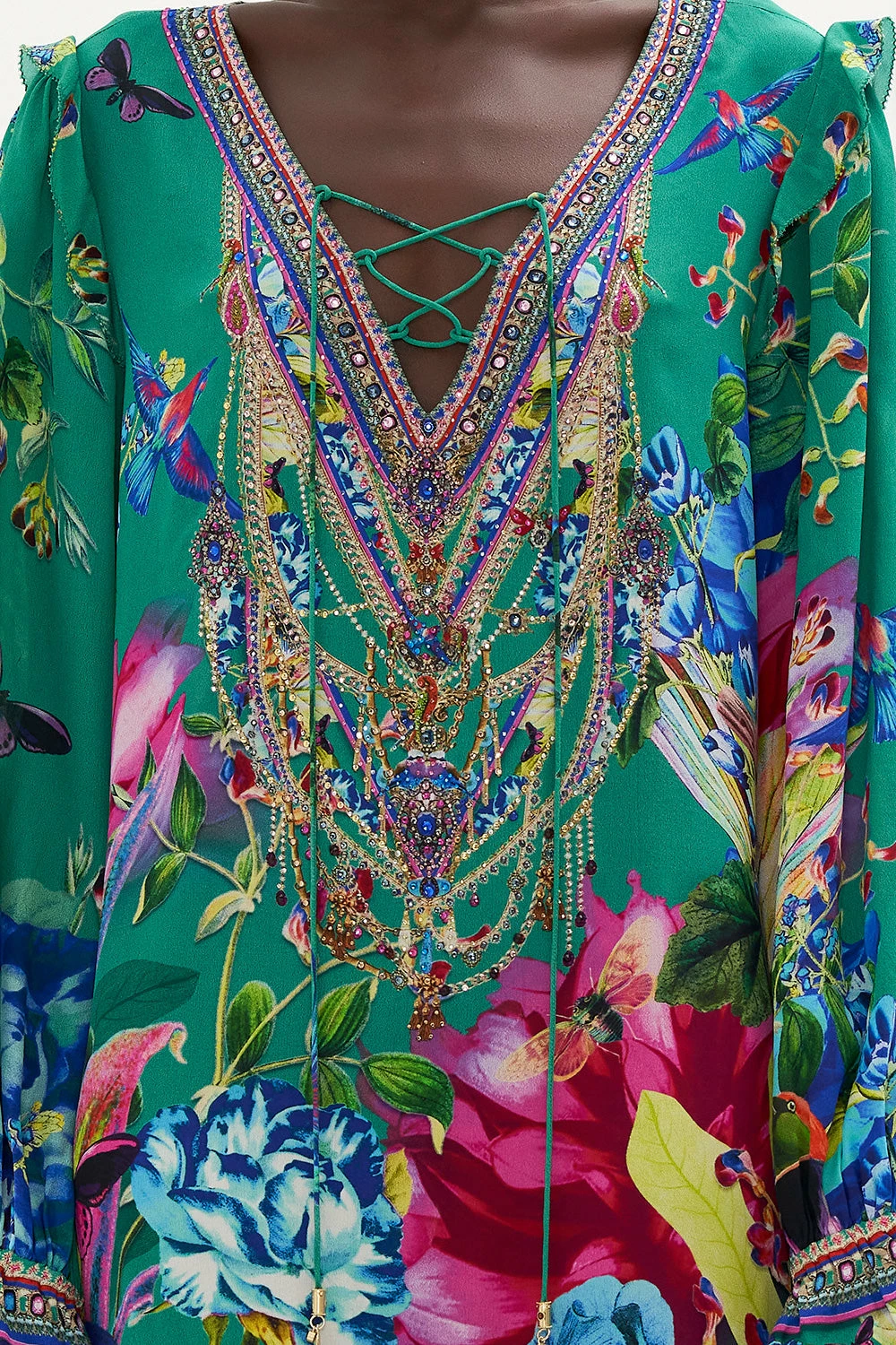 Depicting scenes of nirvana upon whimsical decadence, the Run From Paradise Ruffle Lace Up Dress is effortlessly enveloped by a rich green teal defined by vibrant birds of paradise, cascades of tulips dipped in ocean tones and bouquets of forest ferns. Complete with hand-embellished CAMILLA crystals, this luxury silk dress features lace-up accents at the v neckline, a dainty ruffle hemline, delicate blouson sleeves and subtle frill accents at the shoulders.