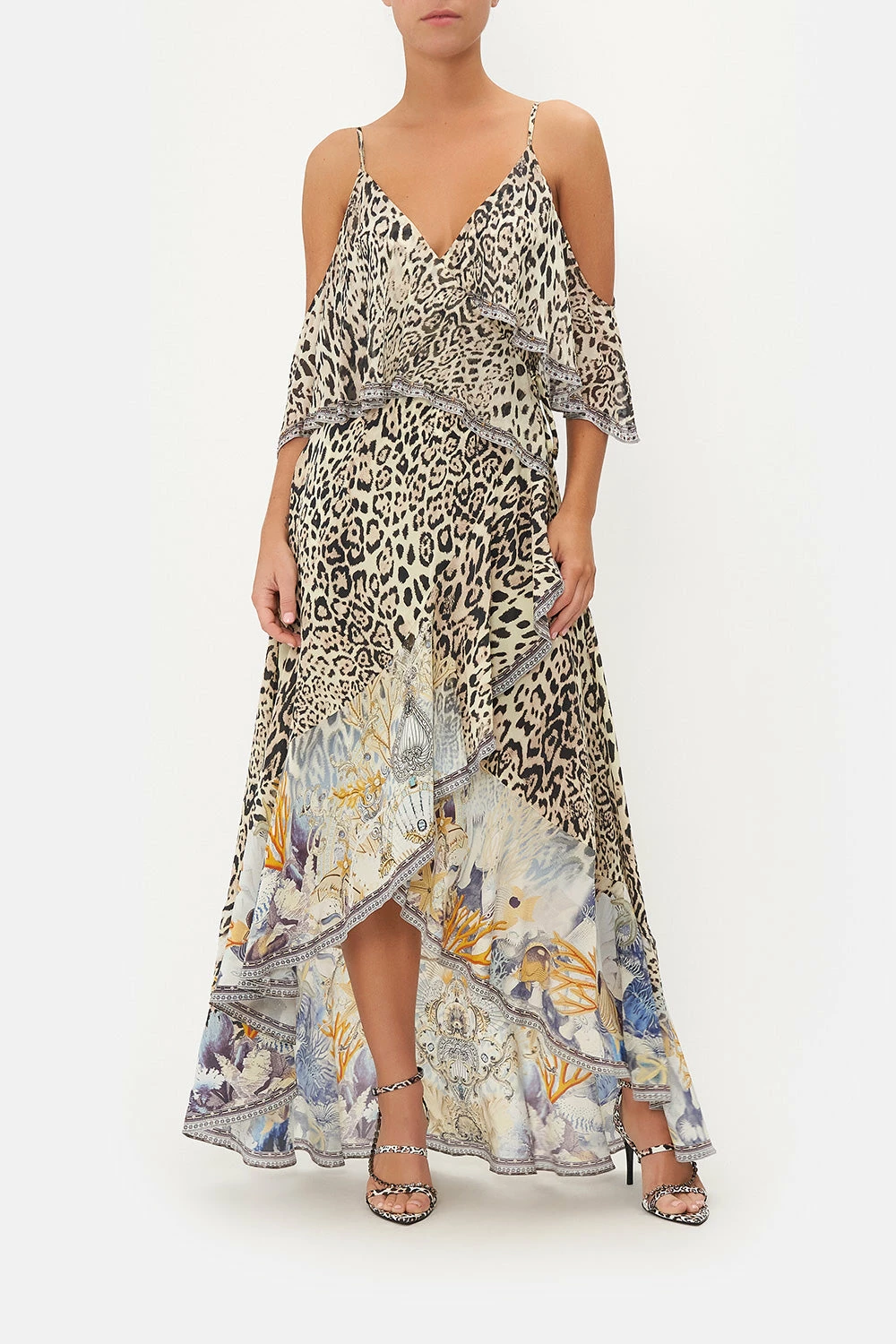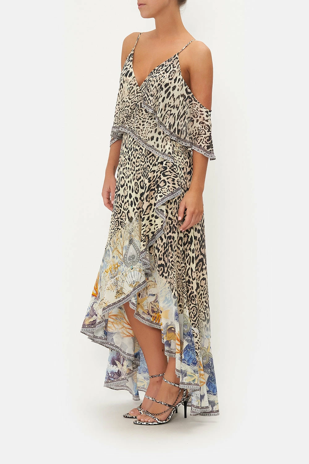 Romantically frilled with the majesties of the sea, our Seahorse Sonnet Ruffle Overlayer Wrap Dress draws on a sandy leopard print adorning soft shades of icy blue, coral reefs of decadent proportions and ornate golden intricacies. Designed from signature CAMILLA silk, this luxury occasion dress plays host to delicate ruffle sleeves that dance at the elbow, a wrap-style design to cinch the waist and a high-low hemline defined by frill.