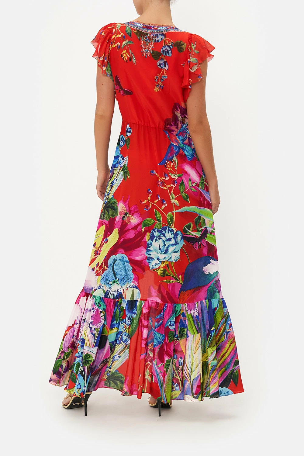 Crafted for the soul seeking to dance the evening away, the Birds Of A Feather Ruffle Wrap Dress draws on a rich watermelon hue defined by vibrant birds of paradise, cascades of tulips dipped in ocean tones and bouquets of forest ferns. Designed from signature CAMILLA silk, this luxury occasion dress plays host to delicate ruffle details that dance at the shoulder, a wrap-style design to cinch the waist and a high-low hemline defined by frill.