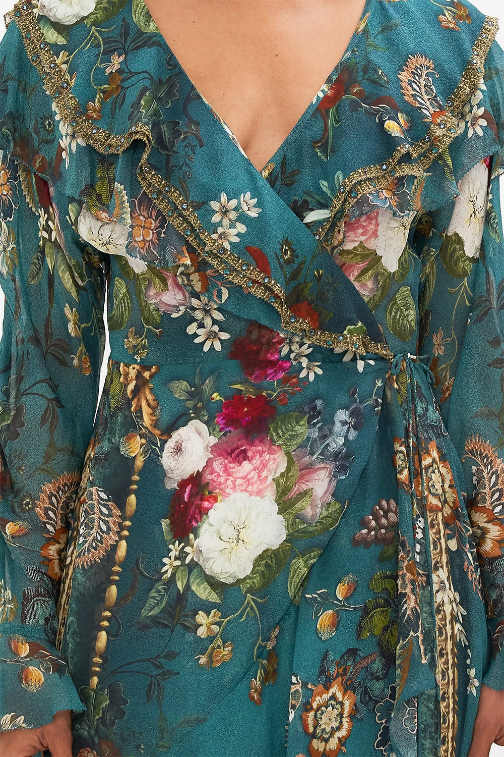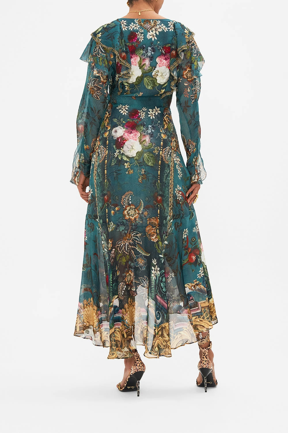 The Verdi’s World Ruffle Wrap Dress is an immersion into the luscious green and opulent golds reminiscent of the Grand Hotel Et De Milano. Crafted from silk, this luxury CAMILLA wrap dress features a statement high-low ruffle hemline, frills at the sleeves and a relaxed wrap-style silhouette that’s designed to cinch and shape the bust and waist. A feminine dress designed for women who move through the world in effortless elegance. Lovingly handcrafted, designed in Australia. Explore more from the Amore Mio collection.