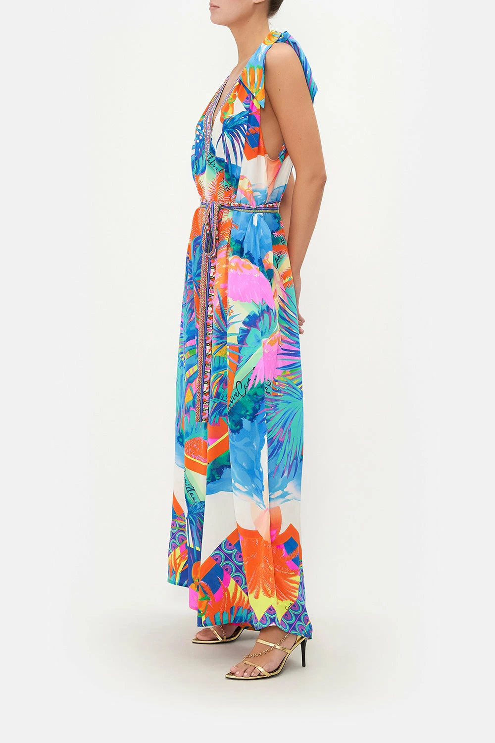The Flamenco Flamingo Scarf Tie Jumpsuit blends a neon nirvana that brings to life fuchsia flamingos, teal-dipped palm dreamscapes and sunset hues that enwrap scenes of Mother Earth’s paradise. Crafted from signature CAMILLA silk, this luxury jumpsuit is home to romantic tie-up detailing upon the shoulders, a relaxed maxi silhouette that falls into a wide leg pant, hand-embellished crystals and a deep v neckline.