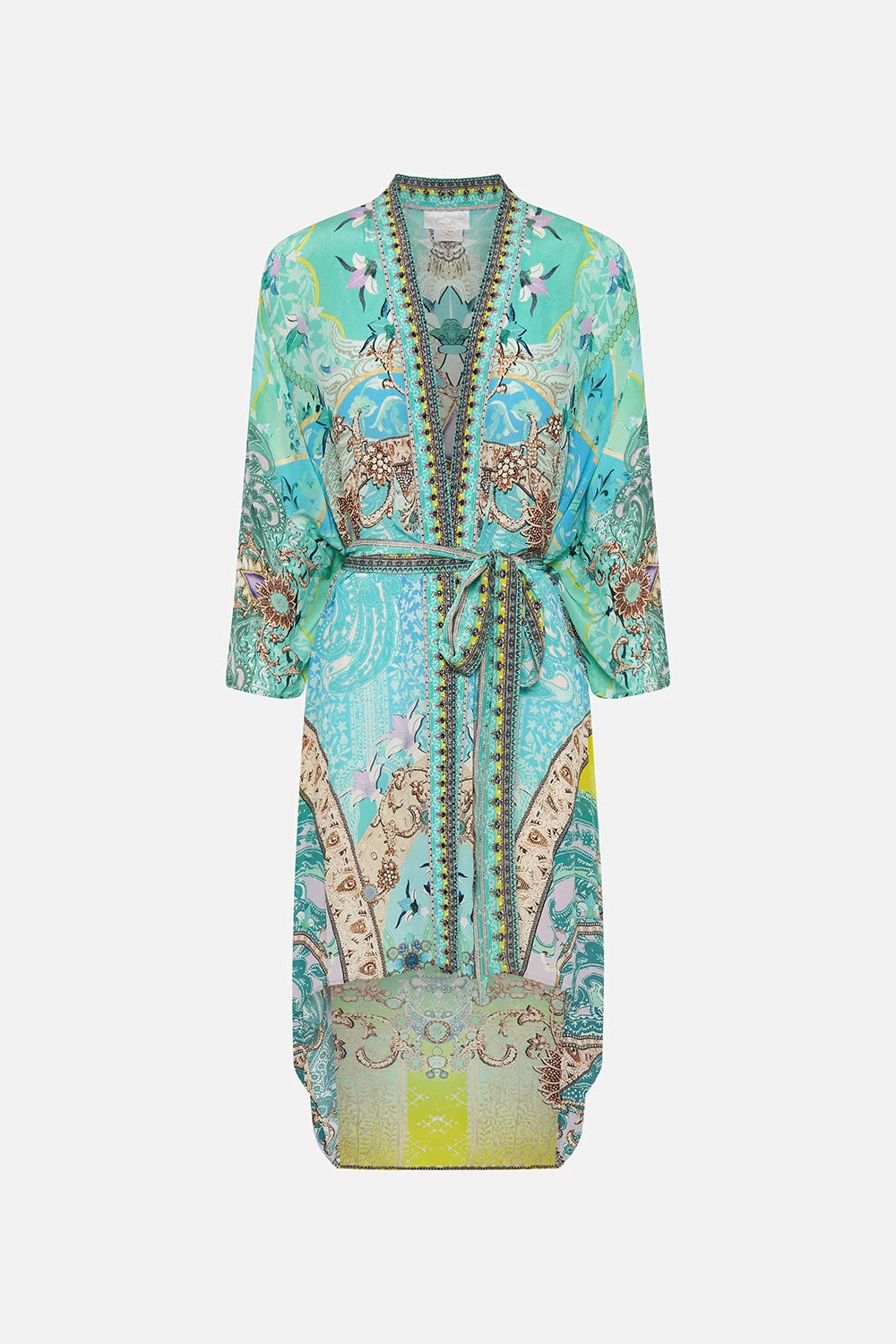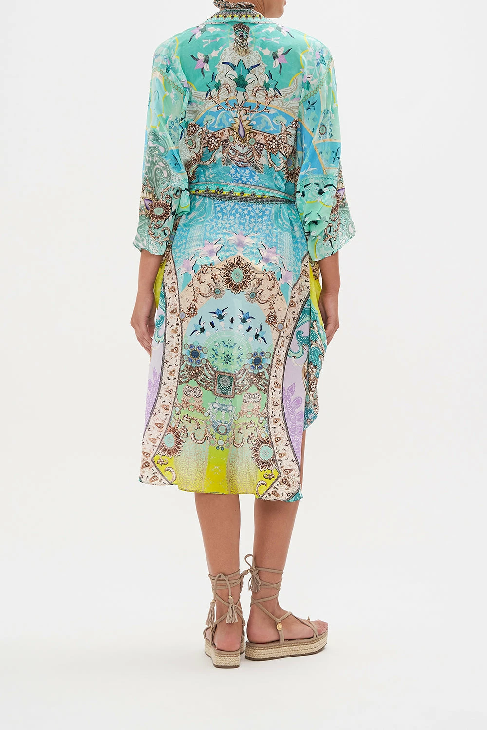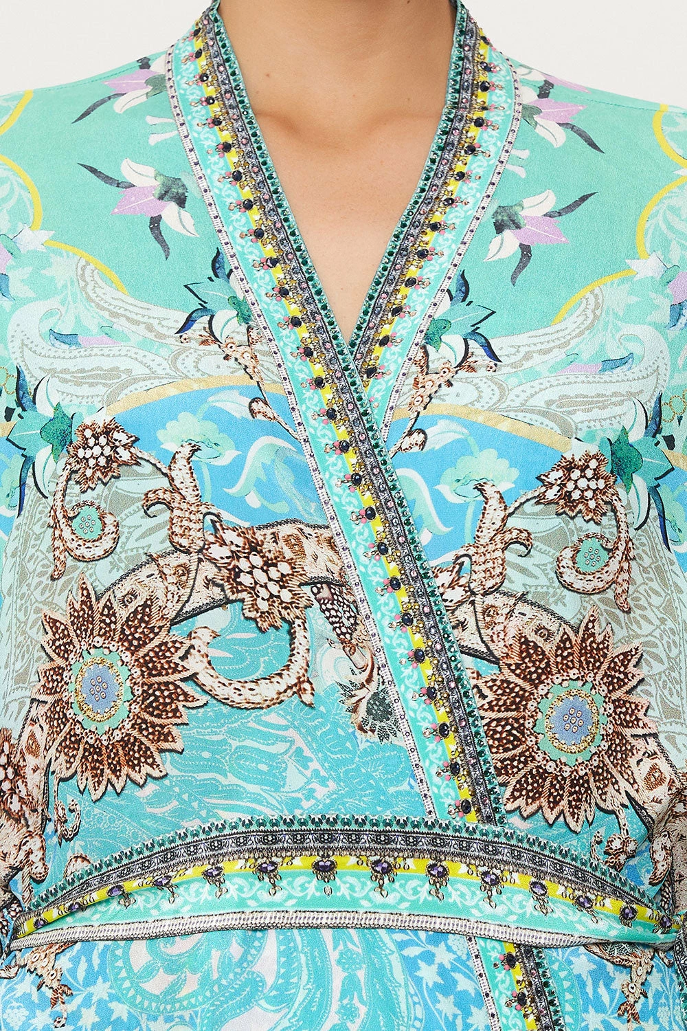 Draping cascades of electric hues upon the skin, our Turn Back Time Scoop Back Layer sets the scene with turquoise paisley indulgence, muted gold floral detailing and intricate panels of tantalising teal. Adorned with hand-embellished CAMILLA crystals along the neckline and tie, this luxury silk plays host to a cinching waist belt, contrasting neckbands, a relaxed midi silhouette and an effortless high-low hemline.