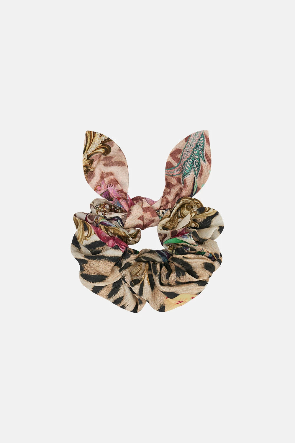 The Queen Atlantis Scrunchie brings back a classic with timeless leopard print finished with petals dipped in blush hues, roped accents and gold baroque detailing. With each scrunchie holding a uniquely placed print, this luxury scrunchie is finished with protective silk so as to not damage your hair, an elasticated silhouette and tie-off detail.