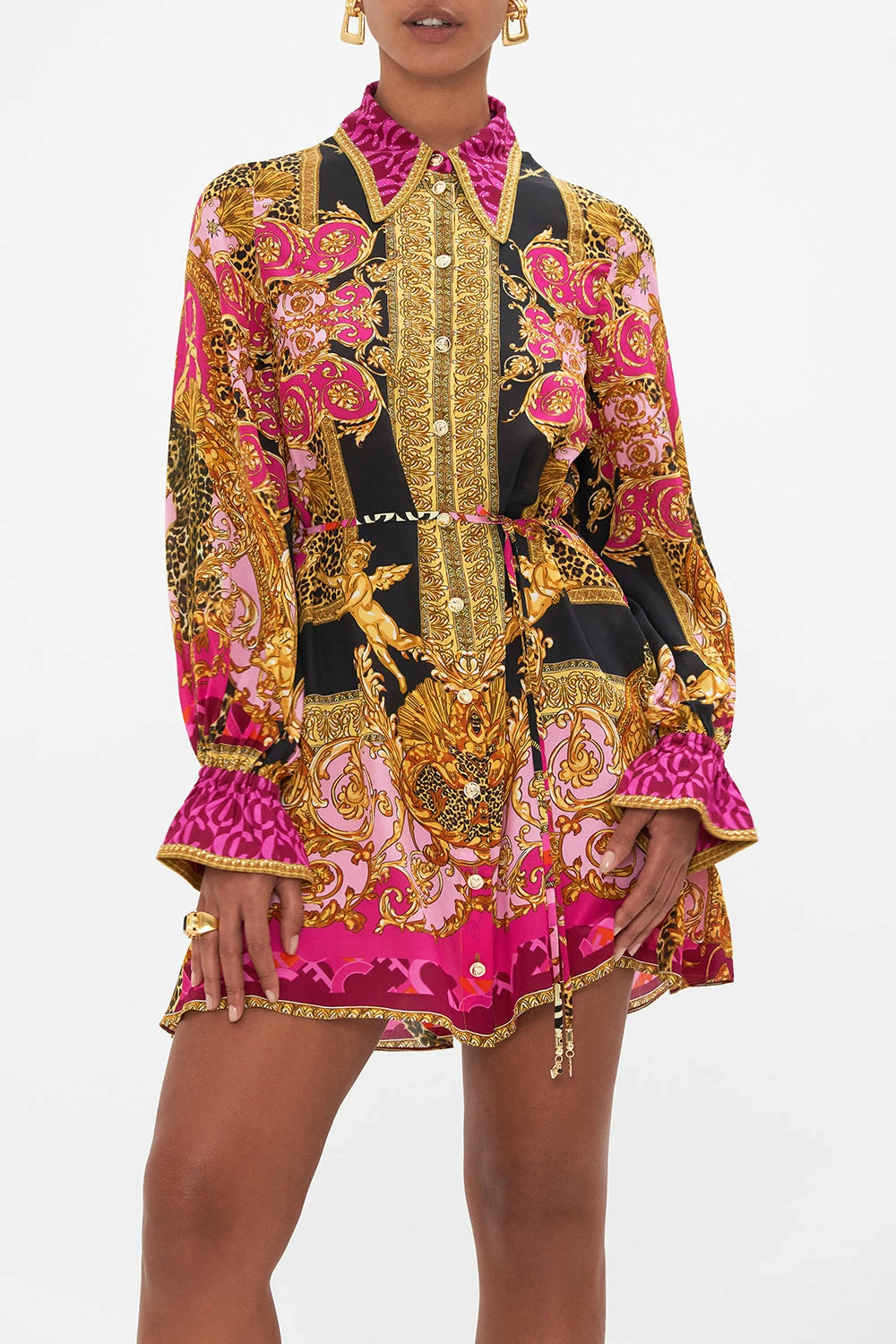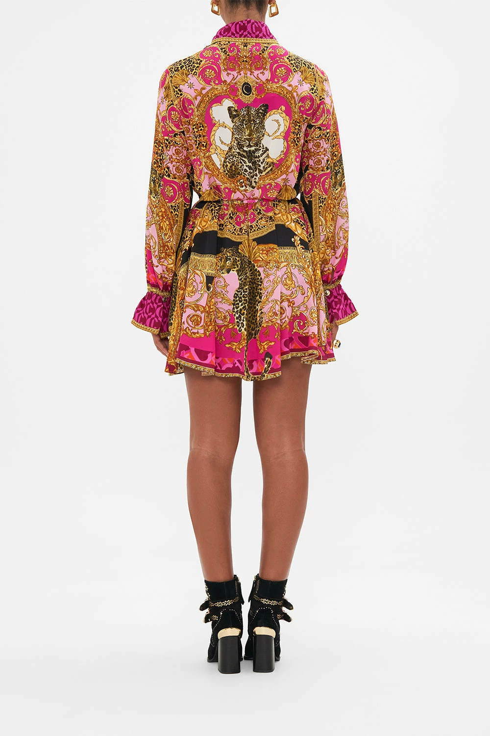 The Ciao Palazzo Shift Shirt Dress captures beautiful border prints entwined with bright feline moments reminiscent of vintage Italian scarf motifs. An elegant printed silk shirt dress that features soft blouson sleeves that gather into wide cuffs to poetic effect. This luxurious button through mini dress features a soft tailored collar, and finished with intricate signature CAMILLA crystals. Lovingly handcrafted, designed in Australia. Explore more from the Amore Mio collection.