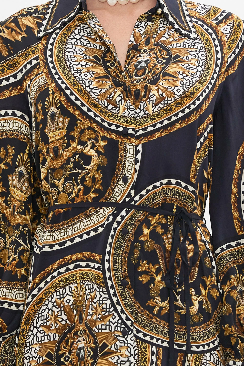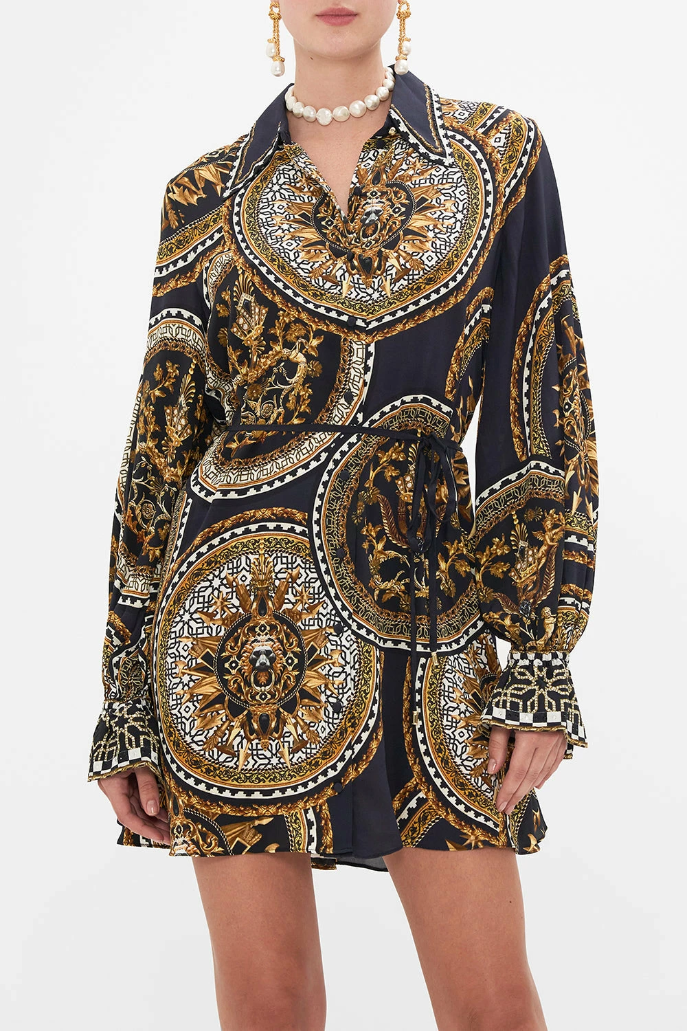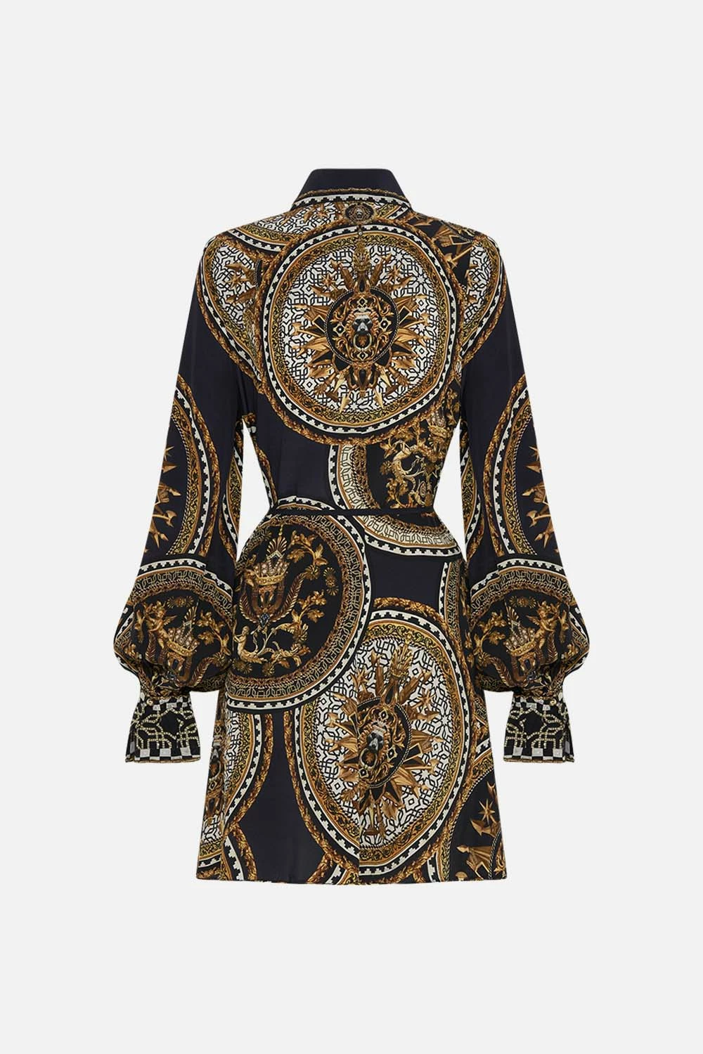 The Duomo Kaleido Shift Shirt Dress celebrates the baroque details synonymous with the opulence of grand Italian duomos. Crafted from signature CAMILLA silk, this decadent mini dress features a structured collar, button enclosure, statement blouson sleeves that meet beautifully into CAMILLA crystal adorned cuffs. A bold workwear dress or elevated into the perfect party dress with CAMILLA accessories. Lovingly handcrafted, designed in Australia. Explore more from the Amore Mio collection.