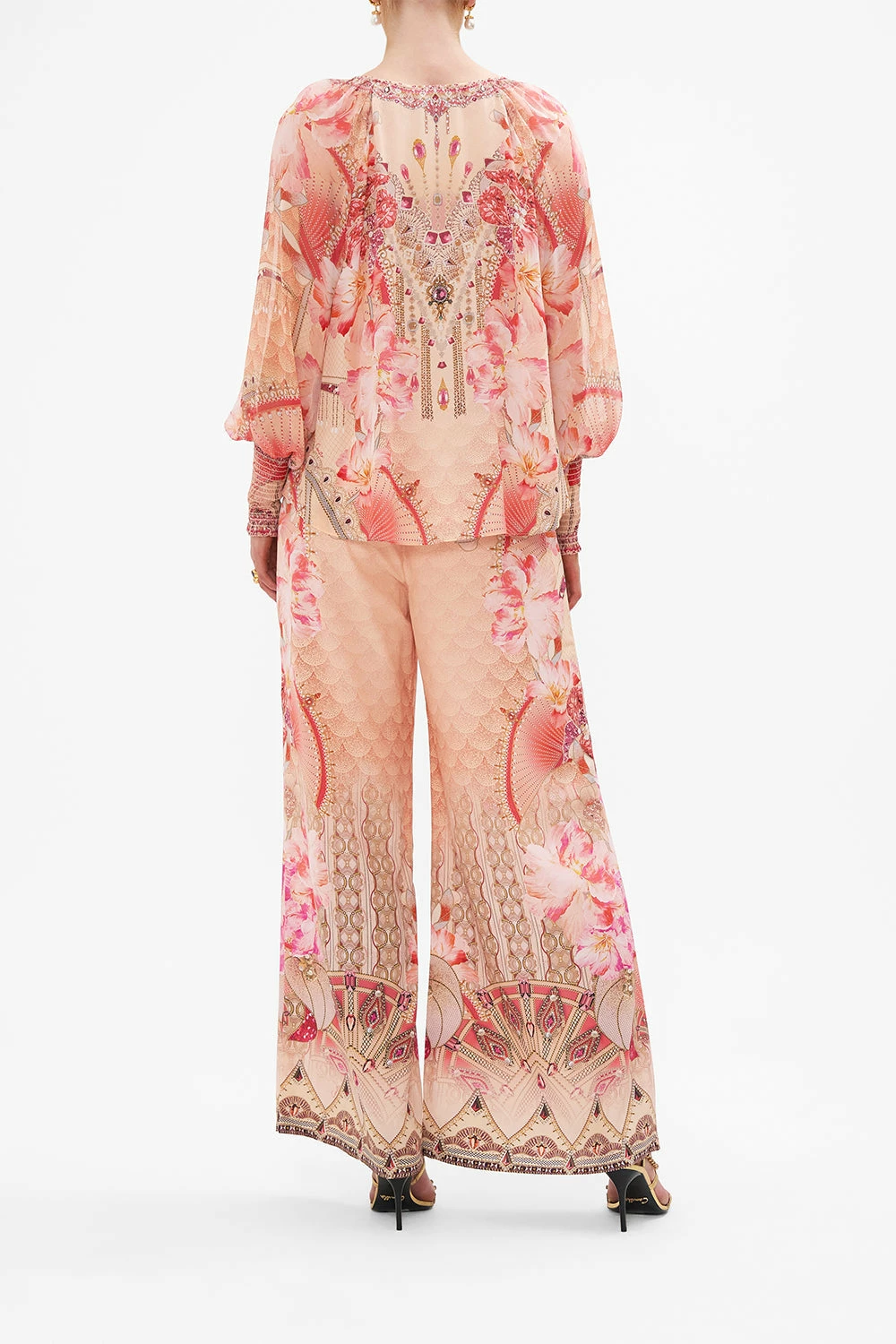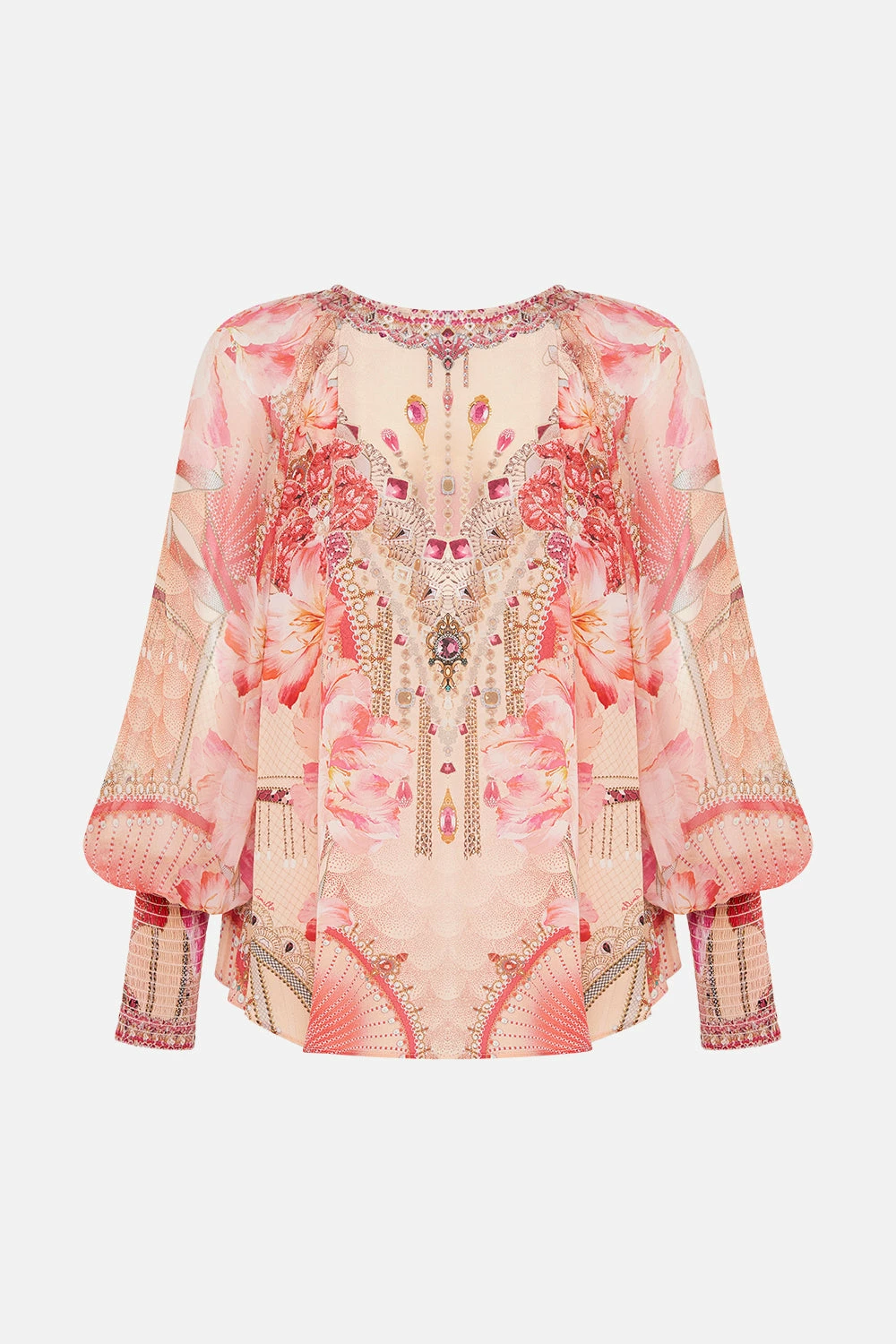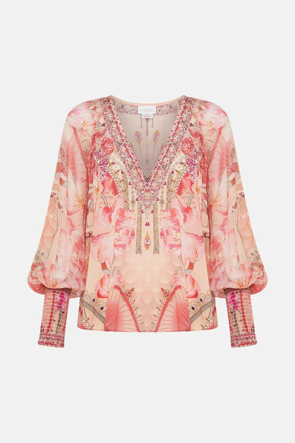 The Adore Me Shirred Cuff Blouse embodies an arrangement of soft pink blooms set against peachy blush tones and delicate unfurling fans of pretty pearls and sparkling jewels. Complete with hand-embellished CAMILLA crystals, this luxury silk crepe blouse is home to billowy blouson sleeves, a deep v neckline that meets an intricate amulet, shirring details at the cuffs and a relaxed silhouette made perfect for French tucks. Lovingly handcrafted and designed in Australia, explore more from The Moral Of The Story: Act II collection.