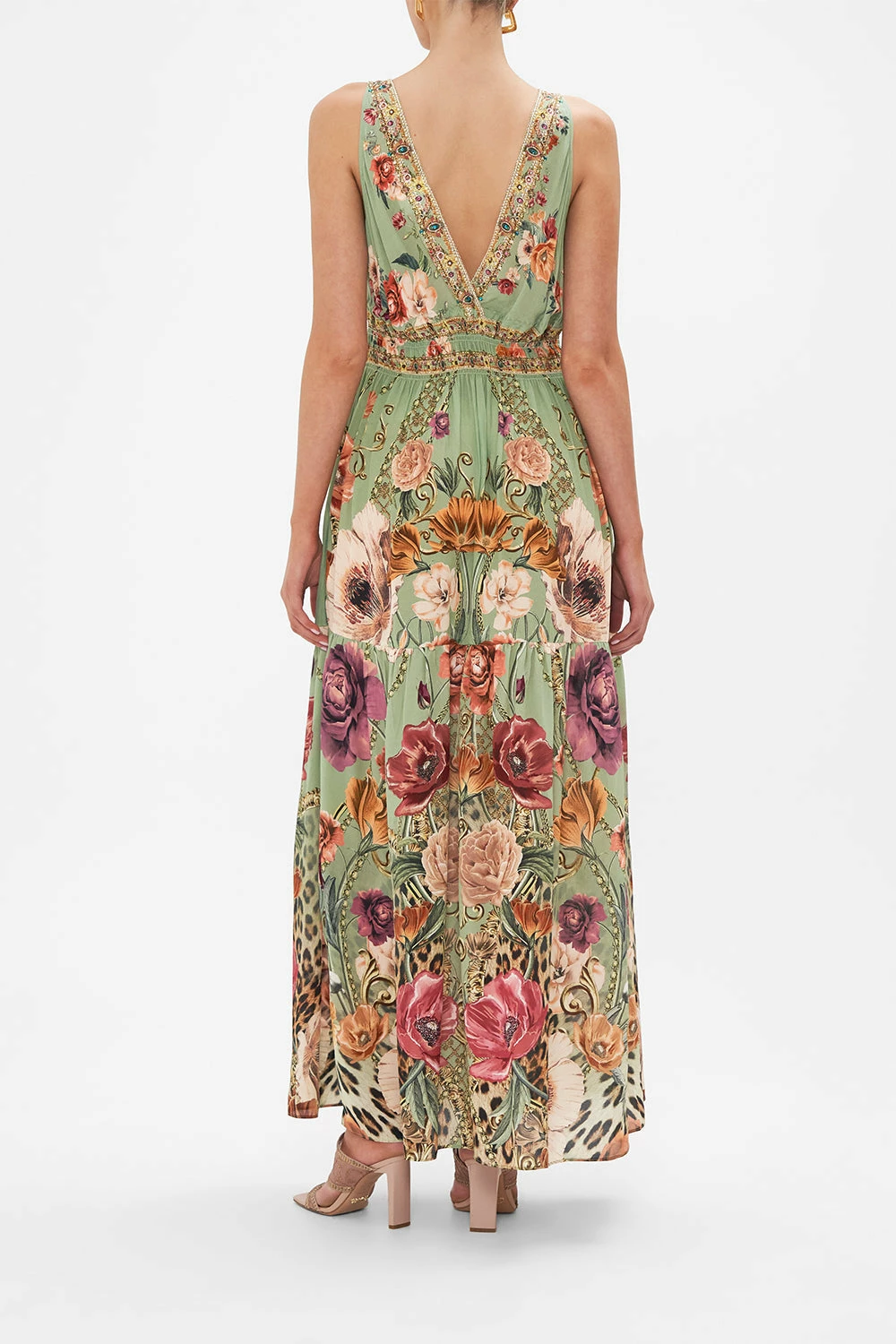 The Grow & Glow Shirred Waist Detail Long Dress takes a stroll through a decadent garden of richly coloured blooms intertwined with wild leopard print patterns. Go beyond the frame of fine glimmering golden swirls and lattice details that shine against a base of soft green tones to hear your destiny calling. Crafted from the softness of silk, this luxury occasion dress offers a deep v neckline that complements a shaped shirred waistline with adjustable tie, hand-embellished crystals that scintillate amidst the light and a relaxed maxi silhouette that falls softly to the feet. Lovingly handcrafted and designed in Australia, explore more from The Moral Of The Story: Act II collection.