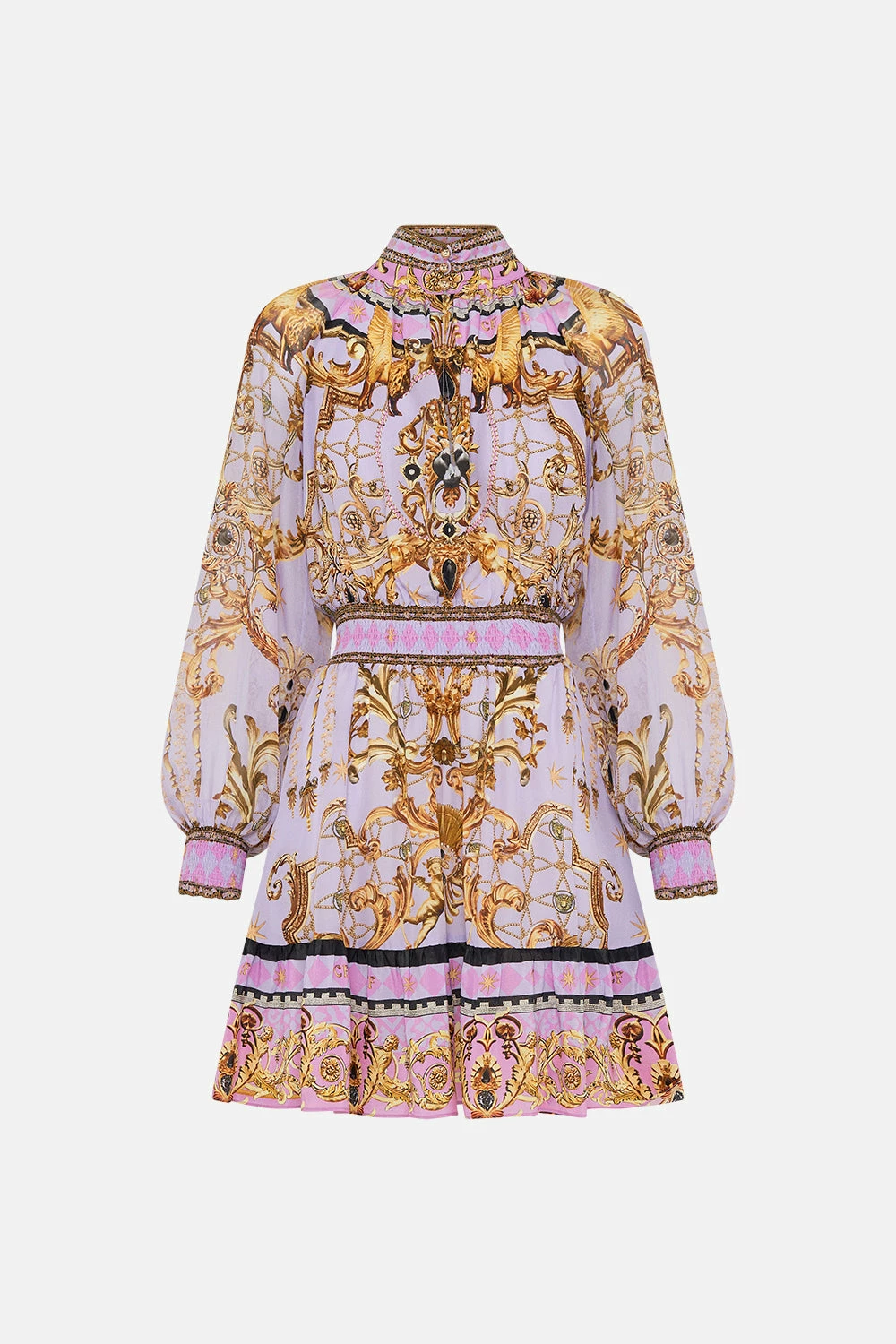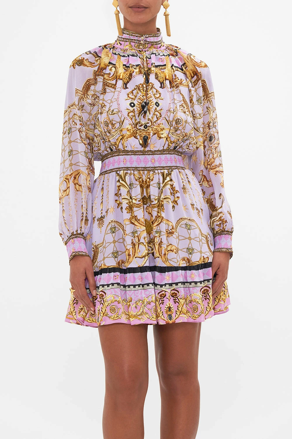 SHIRRED WAIST HIGH NECK MINI DRESS LAVENDER EVER AFTER