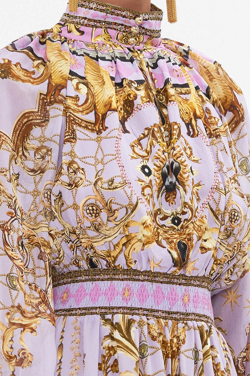 The Lavender Ever After Shirred Waist High Neck Mini Dress steps into a pastel dreamscape of sculptural curves and gilded fronds. A heavenly arrangement of charms and royal crests imbued in myth and magic. Epitomising dramatic elegance this luxury silk mini dress is adorned with a high neck collar that flows into a keyhole detail, soft blouson sleeves with cuffs, a cinched in shirred waistband and flowy skirt that falls gracefully to mid thigh length. Lavishly versatile as an elegant wedding guest dress or a chic party dress to add stunning drama to an evening of enchantment. Lovingly handcrafted, designed in Australia. Explore more from the Amore Mio collection.
