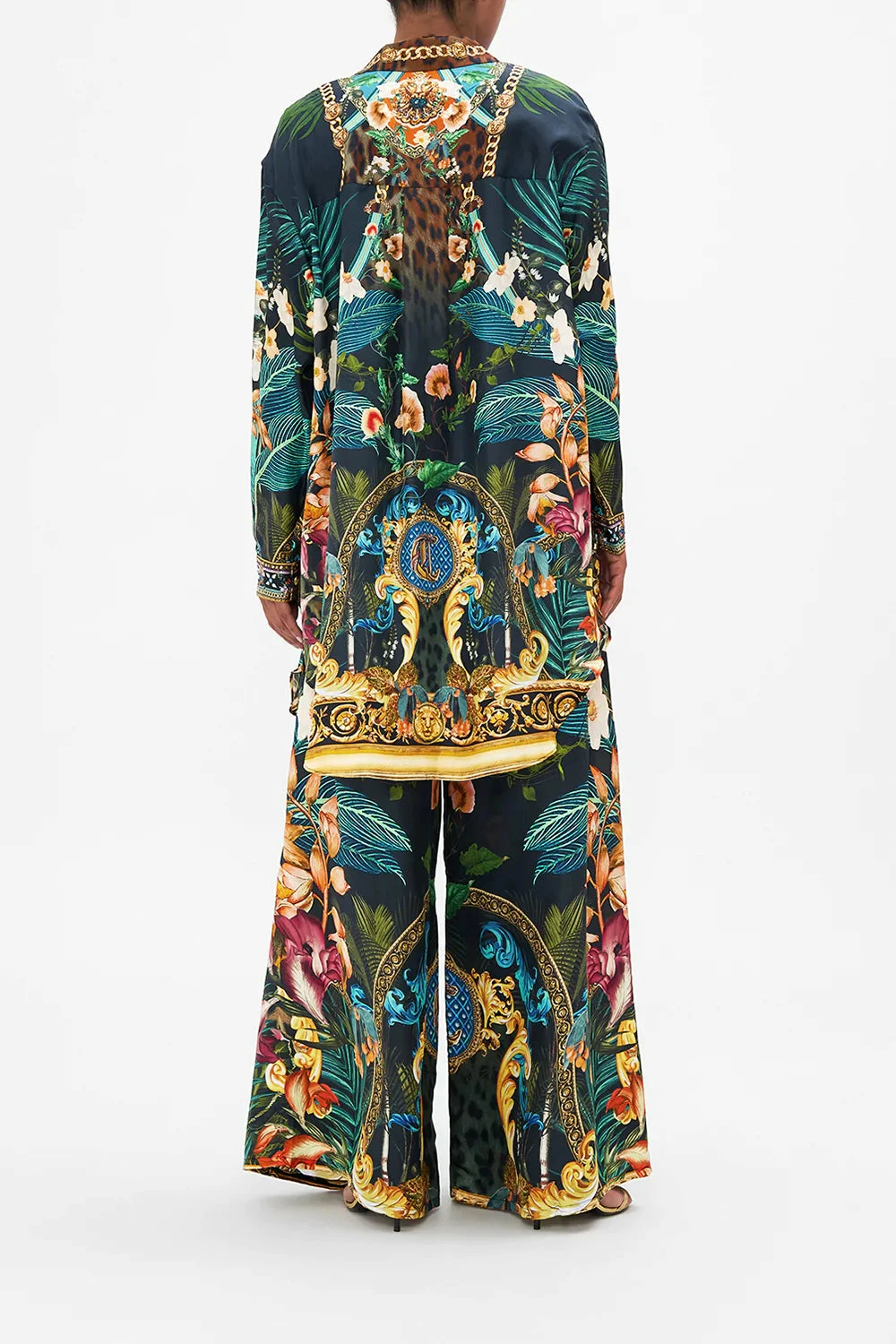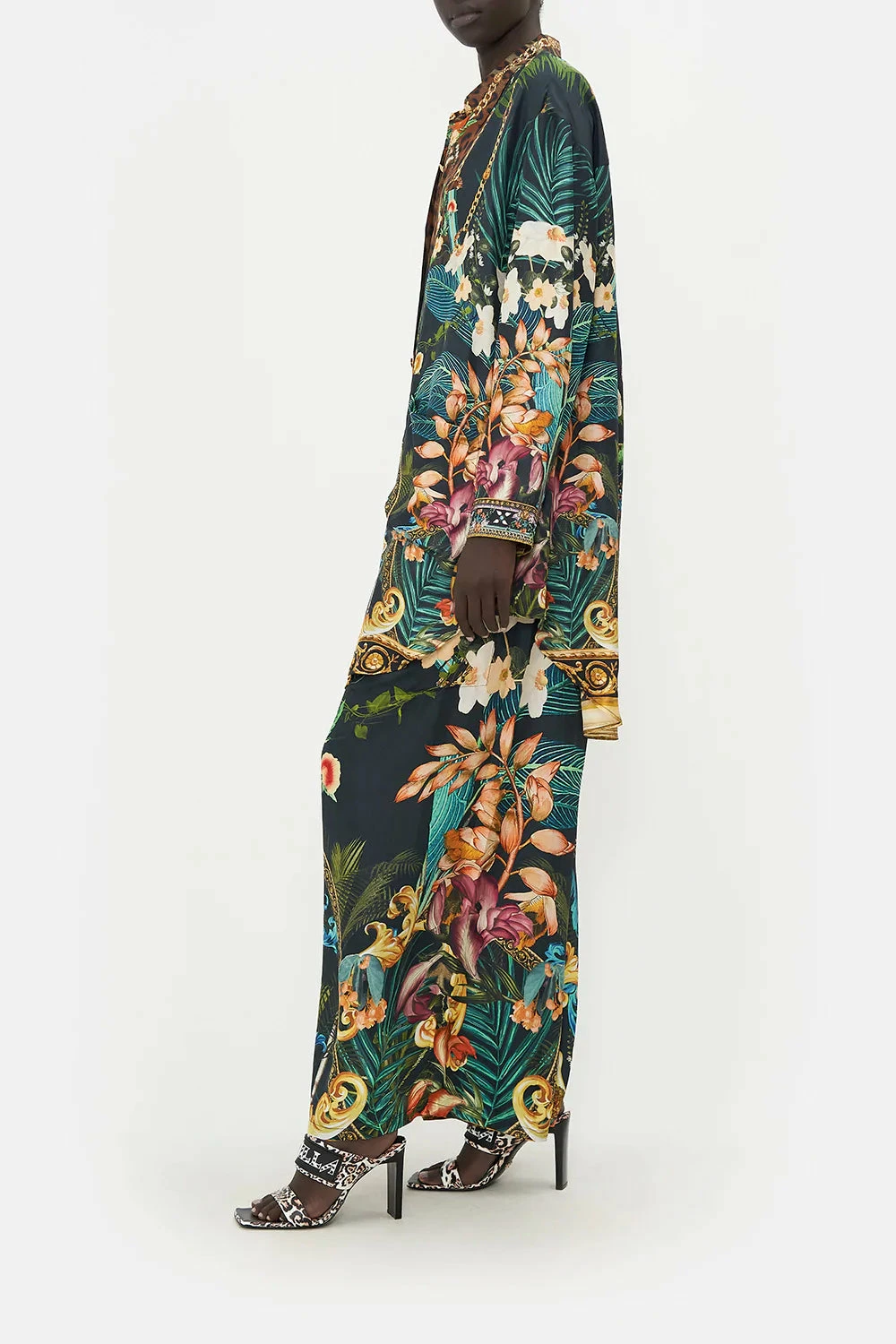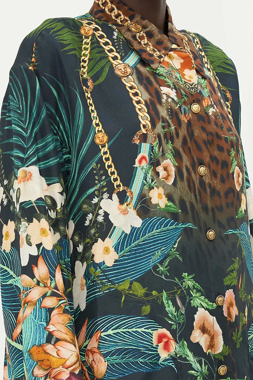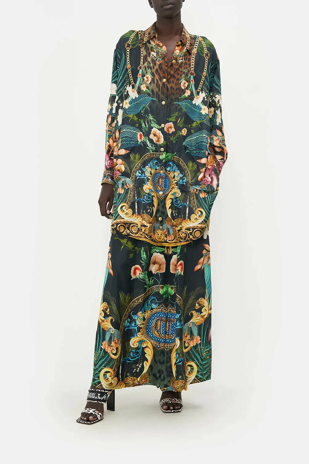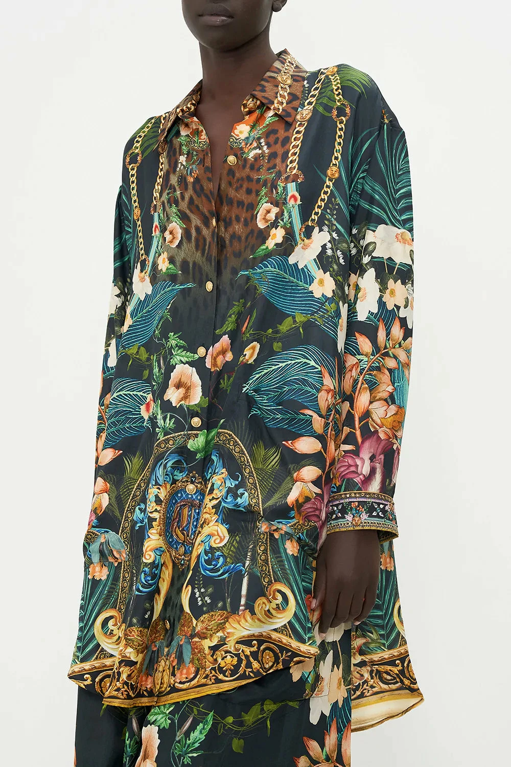 The Fearless Felis Shirt Tunic With Pockets captures our gaze with a sea of rich midnight hues enveloped by gold baroque details, cascades of forest ferns and soft botanicals dipped in honey hues that bloom from emerald vines. Crafted from signature CAMILLA silk, this luxury shirt plays host to gold button fastening, hand-embellished crystals, a tailored collar and a relaxed billowy silhouette that meets a curved hemline.