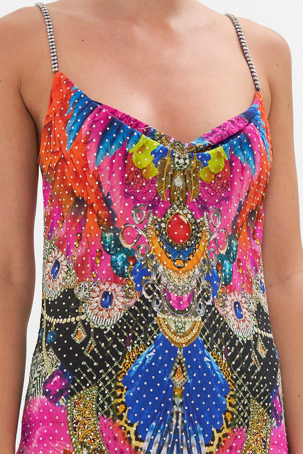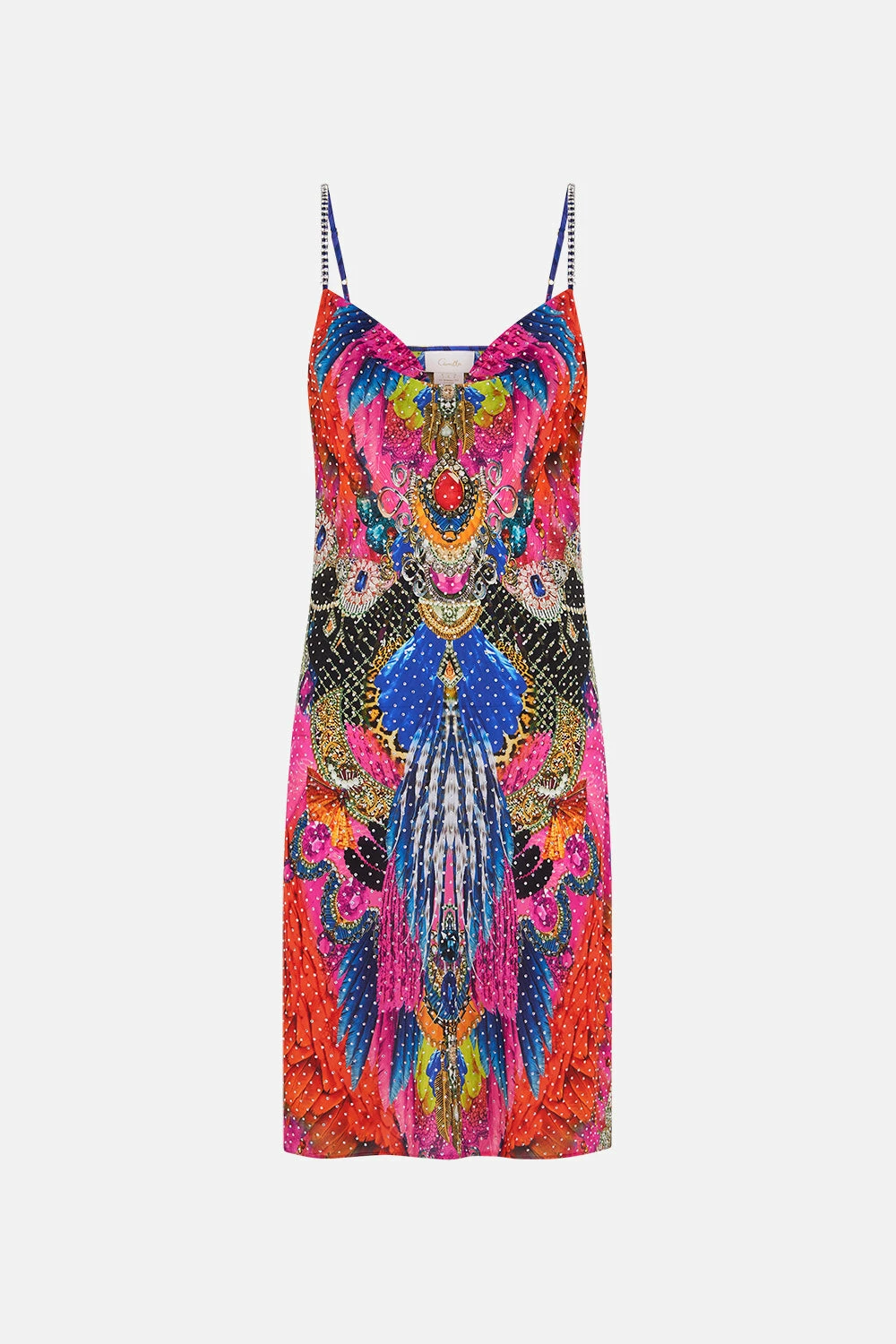 The Dancing With Destiny Short Bias Slip Dress explores a backdrop of periwinkle blue hues finished with vibrant magenta feathers, golden chain cascades and bursts of sunset accents. Crafted from sensational CAMILLA silk, this luxury slip dress plays host to a subtle cowl neck dipped in hand-placed crystal embellishment, a mini on-the-bias silhouette, customisable straps and a slimline cut to hug you in all the right places.