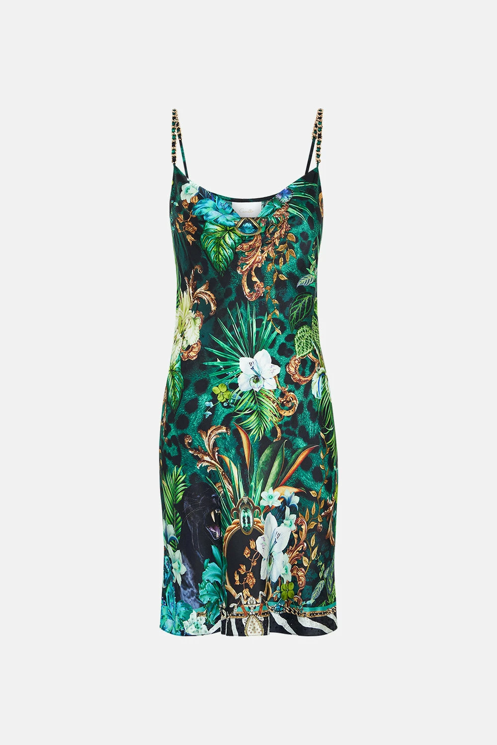 The Sing My Song Short Bias Slip explores lush jungle green hues of unfurling foliage. Vibrant flora and sleek feline fauna guard fine strands of sparkling amulets, precious emerald jewels, and winding vines of golden sprigs. Crafted from sensational CAMILLA silk, this luxury slip dress plays host to a subtle cowl neck dipped in hand-placed crystal embellishment, a mini length on-the-bias silhouette, customisable straps and a slimline cut to hug you in all the right places. Lovingly handcrafted and designed in Australia, explore more from The Moral Of The Story: Act II collection.