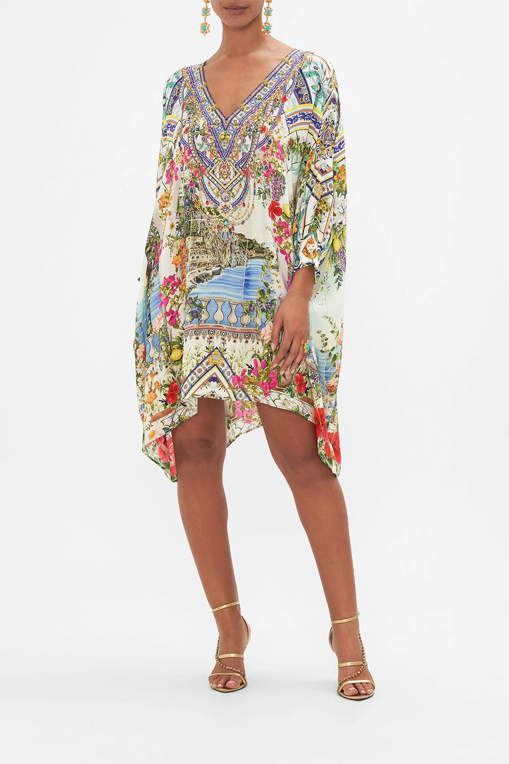 The Amalfi Amore Short Kaftan With Cuff celebrates the vista views through iconic archways lined with fragrant florals at the Hotel Santa Caterina. Crafted from silk, this luxury resort wear CAMILLA kaftan is home to a deep v neckline adorned in crystal embellishments, a softly draped sleeve that dances just above the wrist and a relaxed silhouette that leads into a statement shaped hemline. Wear as luxe resort wear or as a statement party dress. Lovingly handcrafted, designed in Australia. Explore more from the Amore Mio collection.