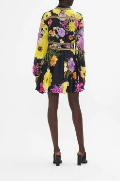 The Curtain Call Chaos Short Kaftan With High Neck interweaves the fine lines of netting and french lace, draped chains, dripping in black diamond gemstone motifs. Crafted with signature hand-embellished crystals, this luxury silk kaftan features a high collar neckline, button down back detail, a relaxed fit silhouette and sleeves with cuff accents. Lovingly handcrafted and designed in Australia, explore more from The Moral Of The Story: Act II collection.