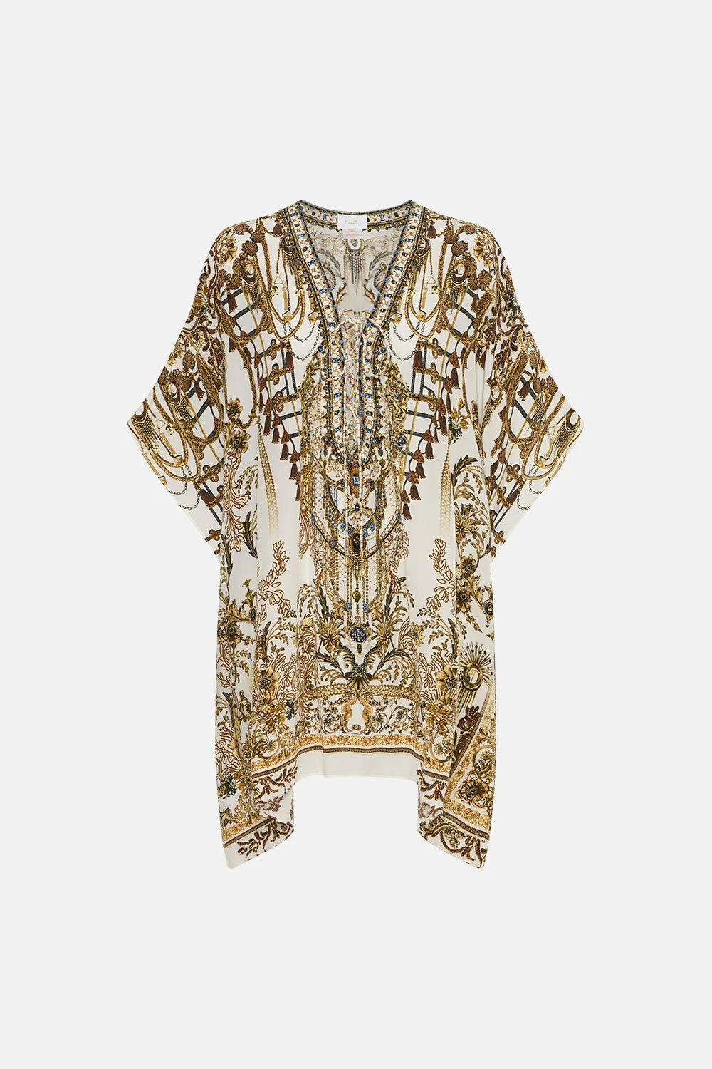 The Road To Richesse Short Lace Up Kaftan explores a mesmorising sea of ivory white hues finished with ornate golden swirls that dance alongside decadent botanical details and exquisite chain cascades. Adorning hand-embellished crystals, this luxury silk kaftan sports a relaxed silhouette that leads into a curved hem, lace up detailing, a cropped sleeve and golden tassel hardware.