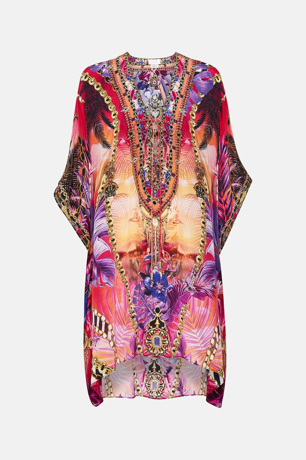 The Wild Loving Short Lace Up Kaftan radiates the warm glow of a sunset paradise. Where wilderness reigns amongst vibrant violet florals nestling against bold magenta palms, laced with intricate gold chains, charms and hints of sparkling amethyst jewels. Adorning hand-embellished crystals, this luxury silk kaftan sports a relaxed silhouette that leads into a curved hem, lace up detailing, a 3/4 length sleeve and golden tassel hardware. Lovingly handcrafted and designed in Australia, explore more from The Moral Of The Story: Act II collection.