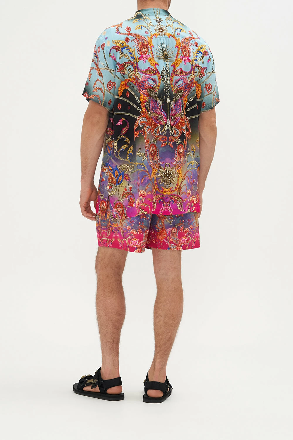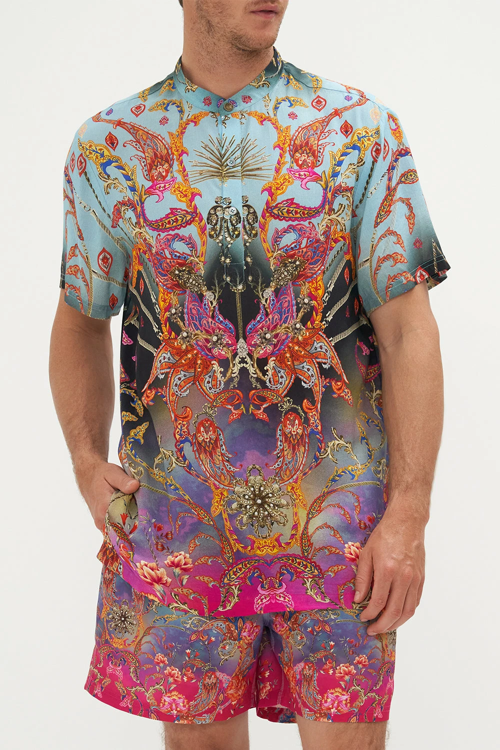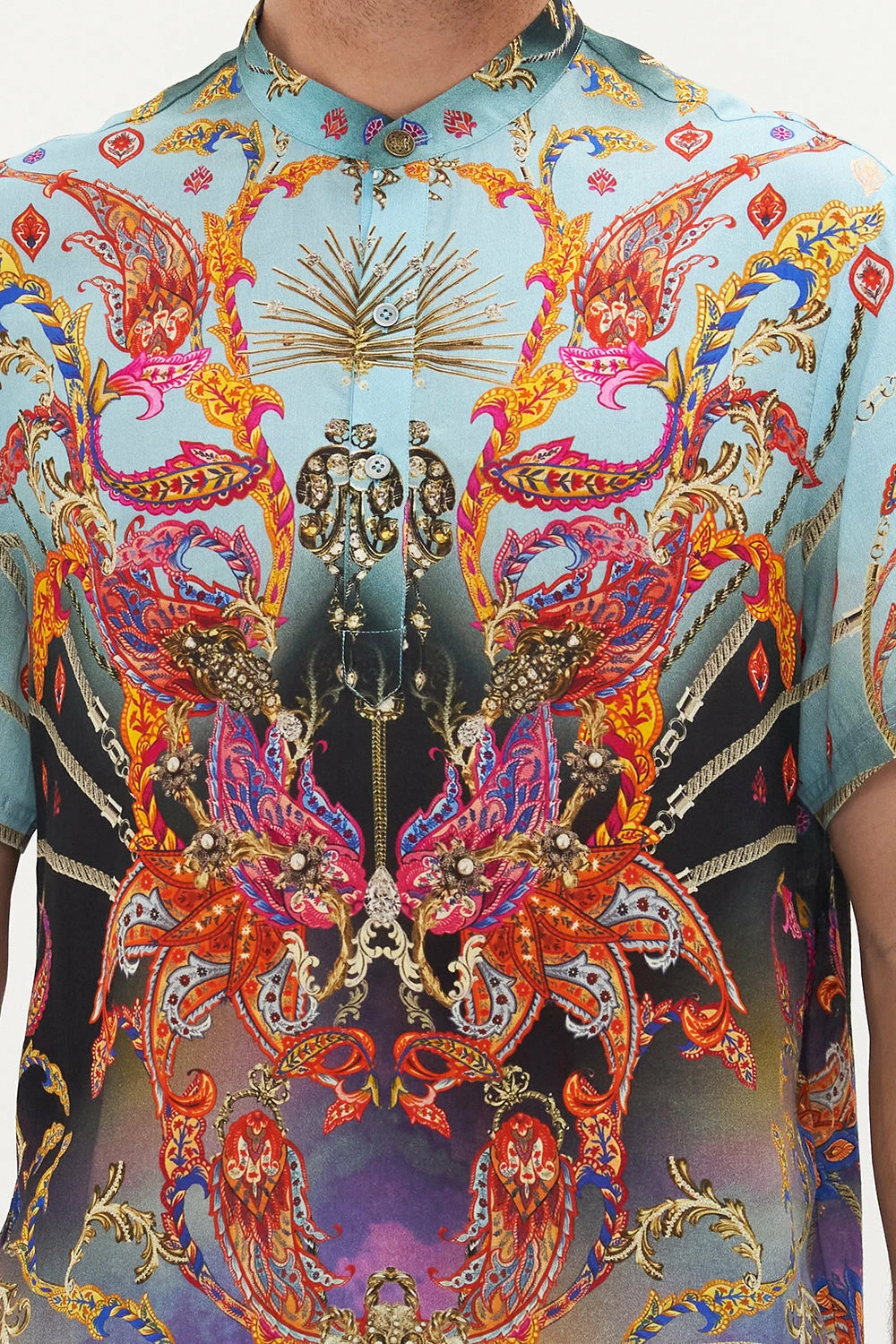 The What Lies Beneath Short Sleeve Mandarin Shirt welcomes the eye to paradise with a sky blue hue graced with paisley patterns dipped in raspberry tones, gold baroque details and a soft gradient that falls into shades of lavender. An elevated essential, this luxury shirt features cropped sleeves, a relaxed silhouette and placket details at the neckline.