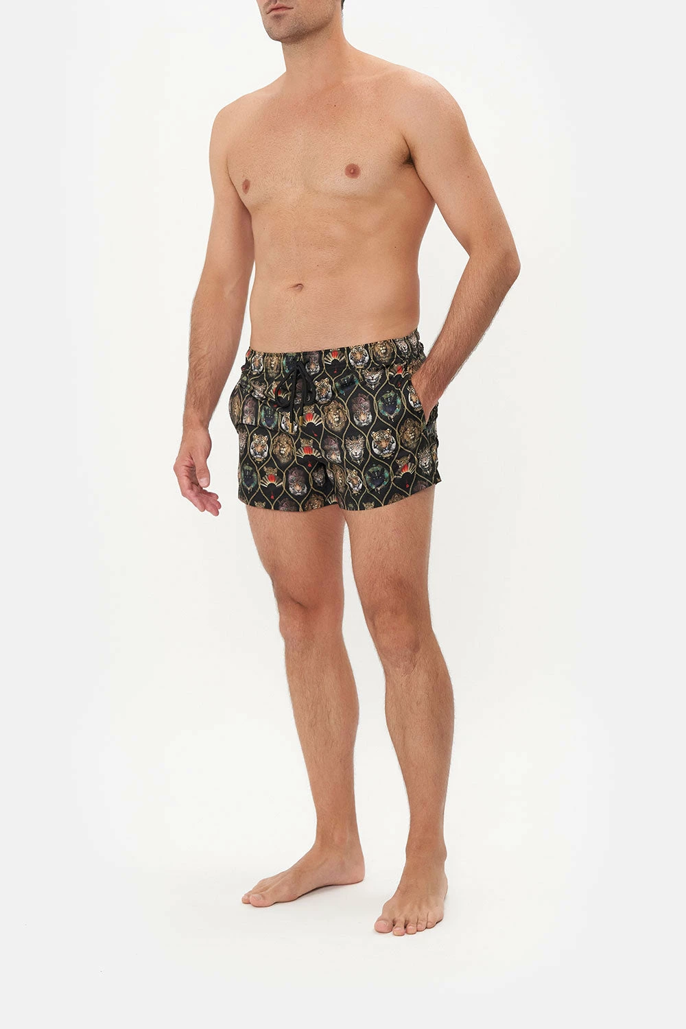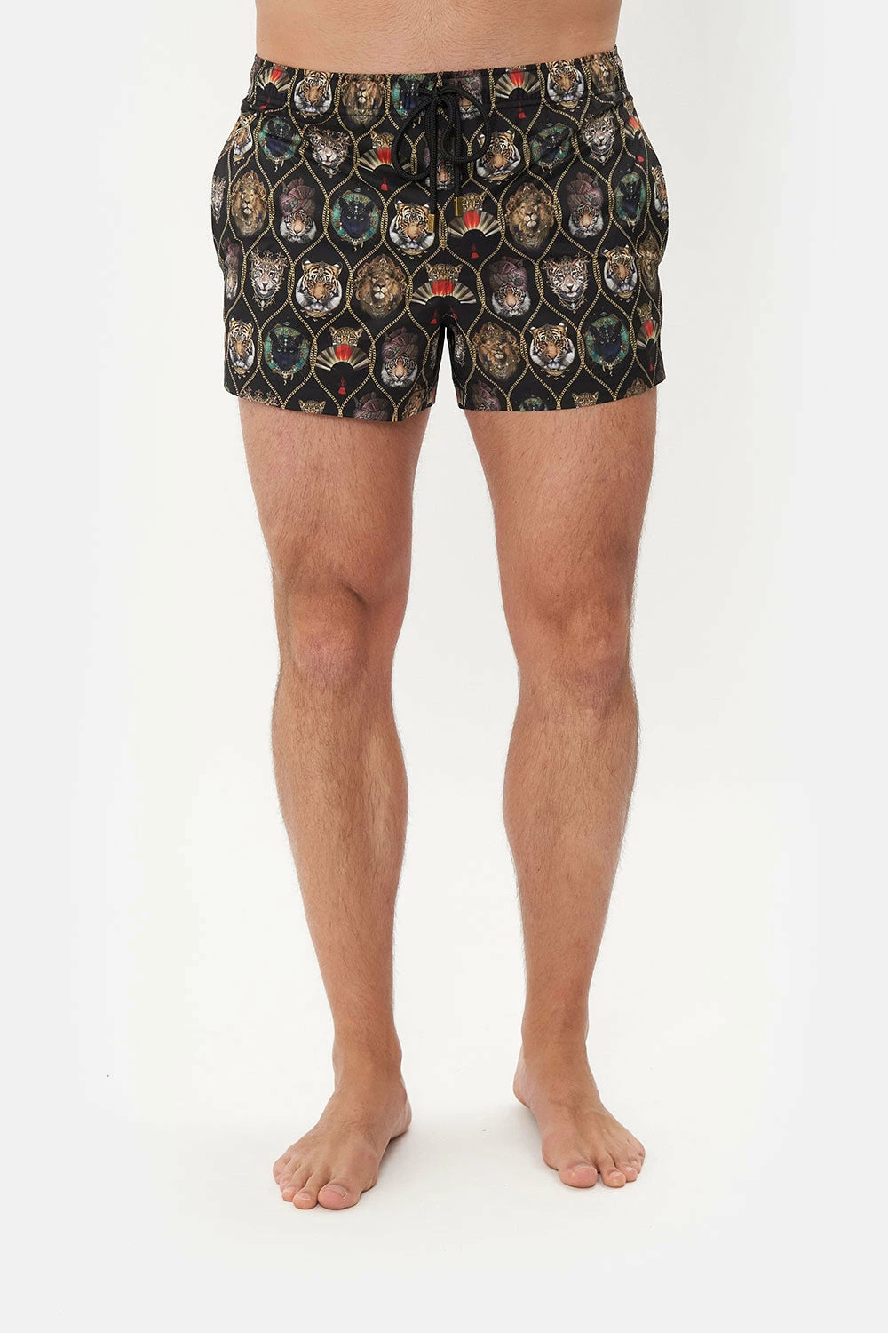 Tantalising eighties beachwear calling to reimagined animalia, the Jaggis Jewels Short Swim Short complements the skin with the powerful poker faces of tigers, lionesses and panthers as they sit amid gold baroque chain details. These luxury swim shorts feature splits at the hemline, mesh lining, an elasticated drawstring waist and a cropped length.