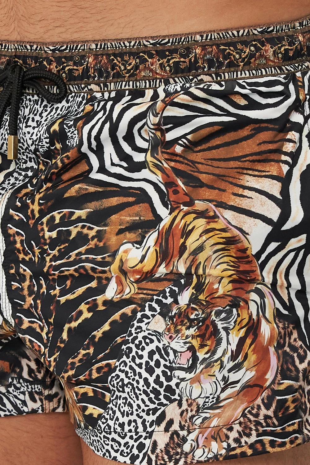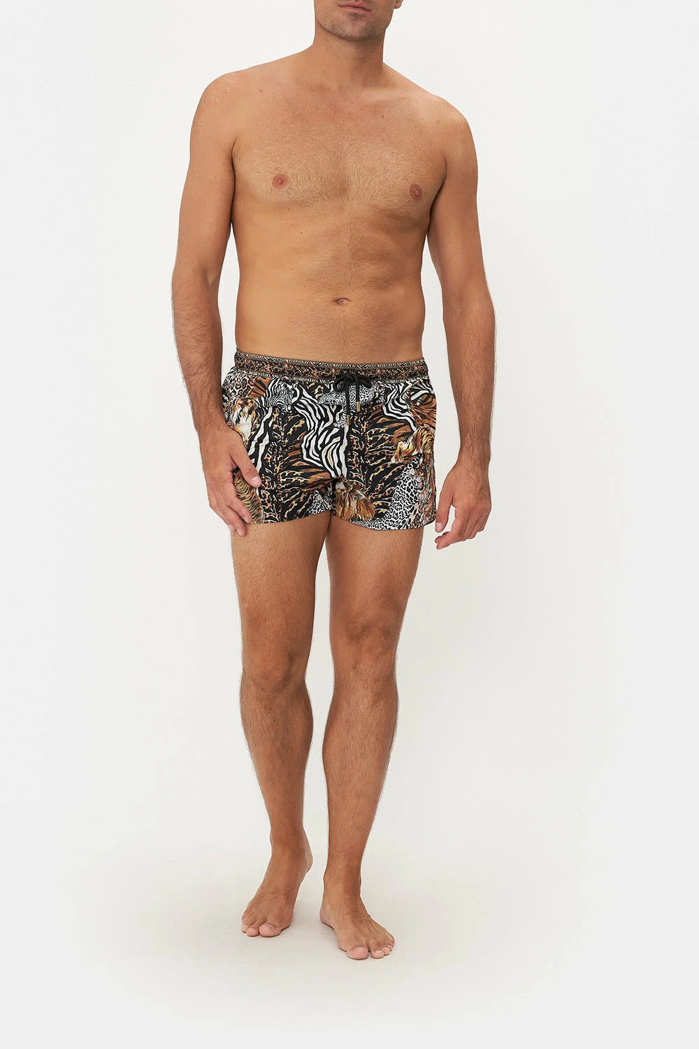 Taking it up a notch with the untamed essence of animalia, the What’s New Pussycat Short Swim Short complements the skin with an intricate mosaic of striking tiger eyes, zebra stripes and cascades of classic leopard print upon a sea of midnight hues. These luxury swim shorts feature splits at the hemline, mesh lining, an elasticated drawstring waist and a cropped length.