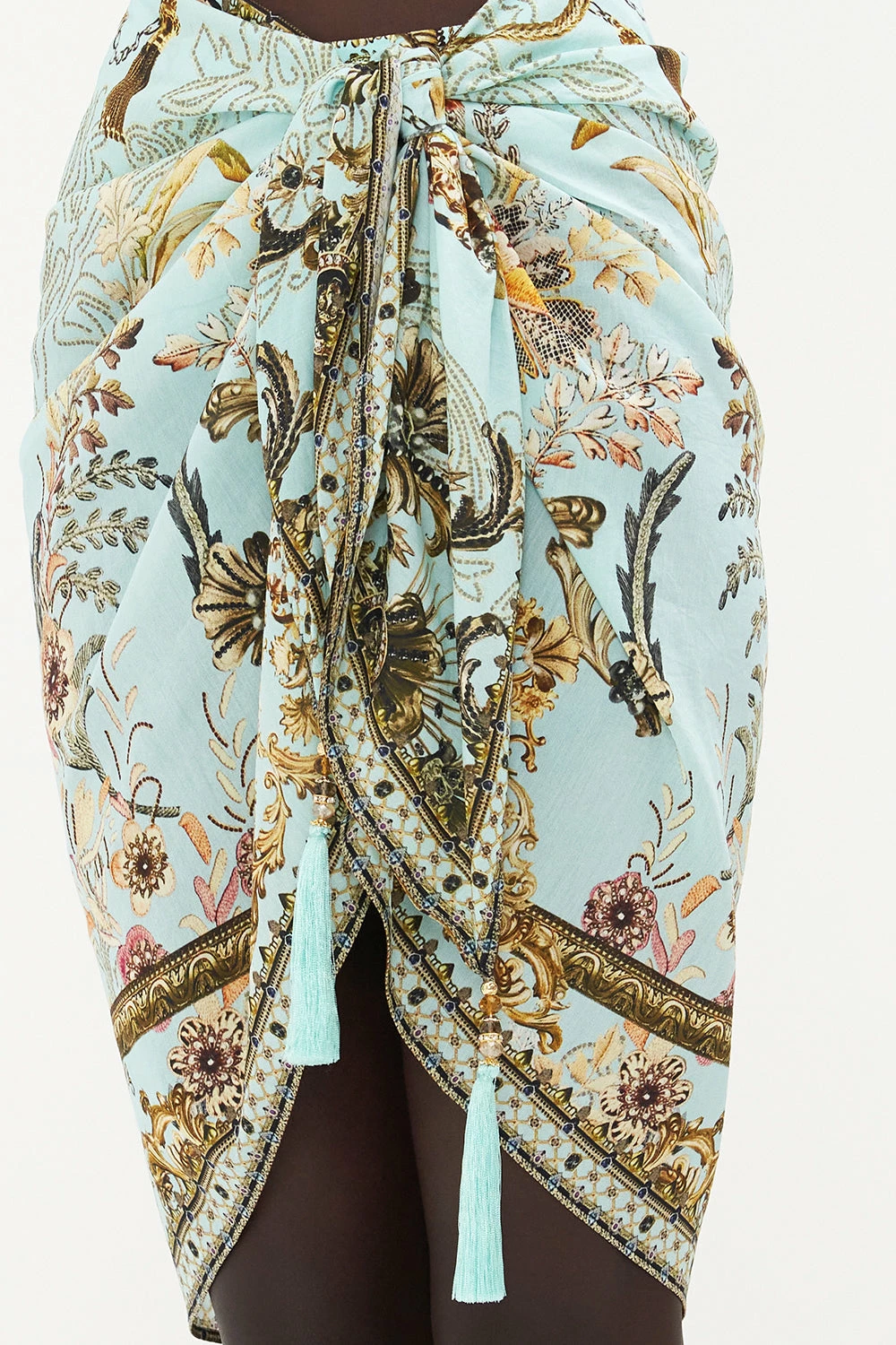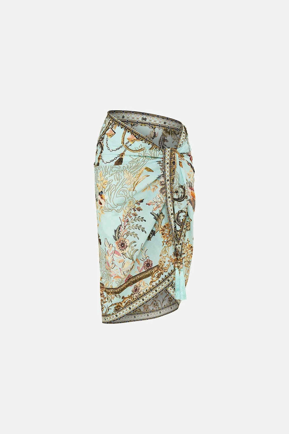 The Adieu Yesterday Short Tassel Sarong explores a mesmorising sea of celestial blue hues finished with ornate golden swirls that dance alongside decadent botanical details and exquisite chain cascades. Crafted from a cotton-silk blend, this luxury sarong wrap is home to a multi-wear design complete with tie-up fastening, gold tassel detailing that shimmers amidst the sun and a contrast panel trim.