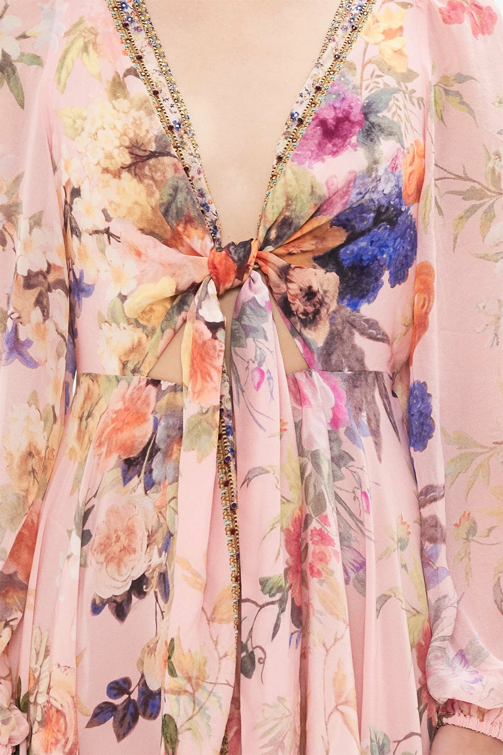 The Letters From The Pink Room Short Wrap Tie Dress depicts an atmosphere of soft pink with turquoise highlights amongst a world of pretty blooms and golden filigree. Crafted from signature CAMILLA silk, this luxury mini dress plays host to vivacious blouson sleeves that compliment a floaty hemline that dances at mid thigh, finished with signature CAMILLA crystals that adorn the timeless tie front neckline. A beautifully feminine floral party dress perfect for sun soaked days or starlit evenings. Lovingly handcrafted, designed in Australia. Explore more from the Amore Mio collection.