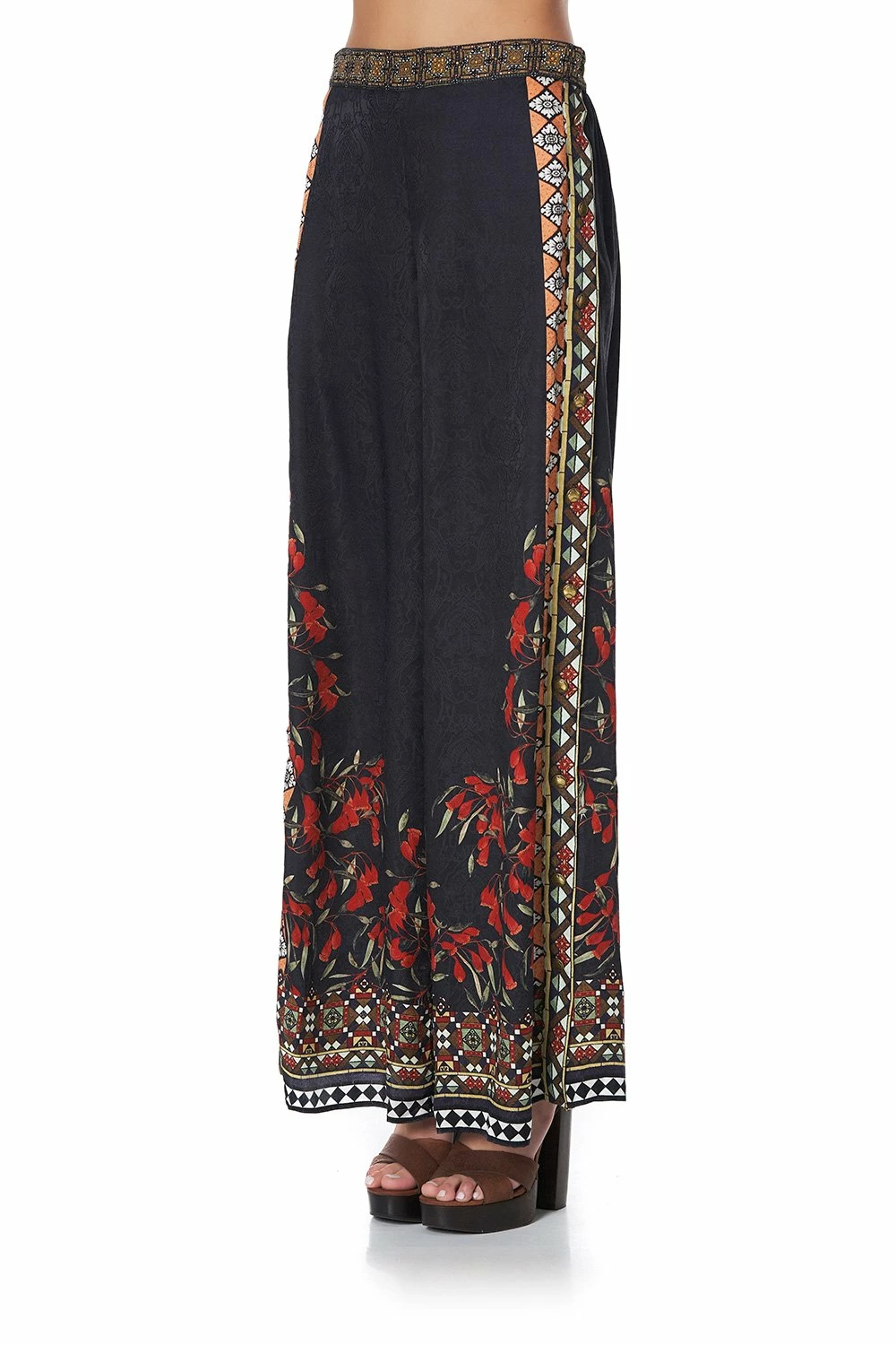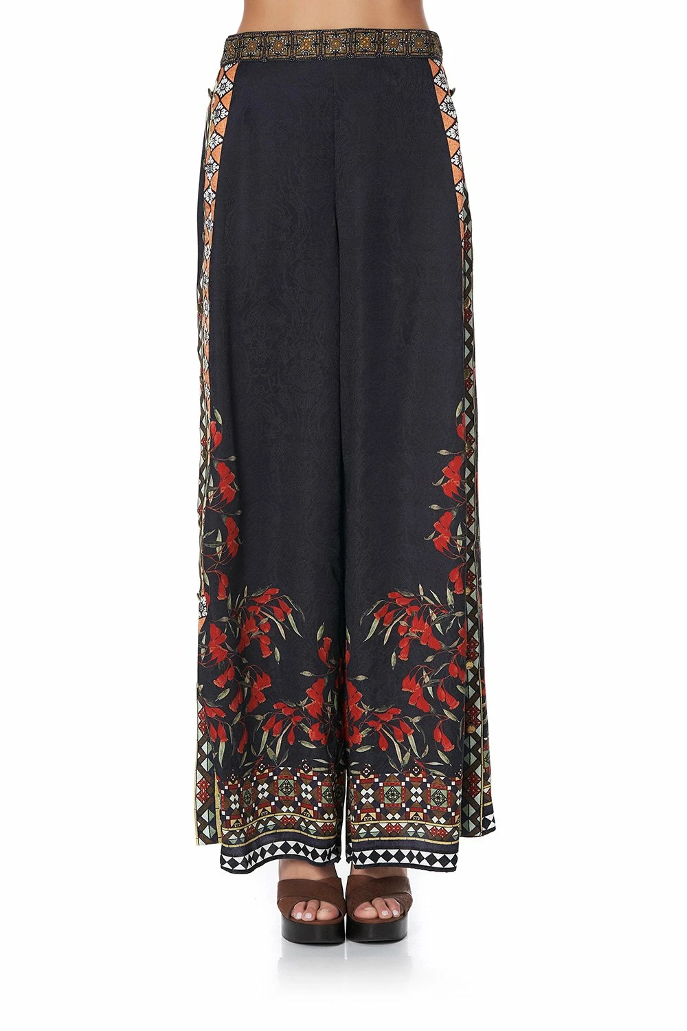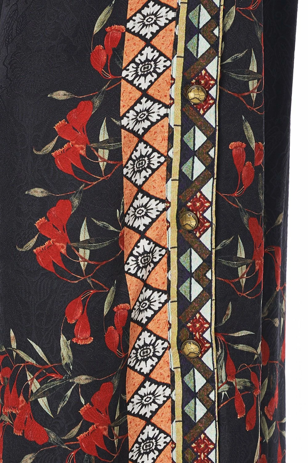 With Federation tile work and the aged upholstered chairs that line historic town halls as joyous inspiration, the Paved In Paisley Side Button Up Pant oozes luxury. With golden flourishes and crimson pops, these silk trousers feature flattering button through side panels, a comfortable elasticated back waist, loose flare leg, as well as digitally printed silk.