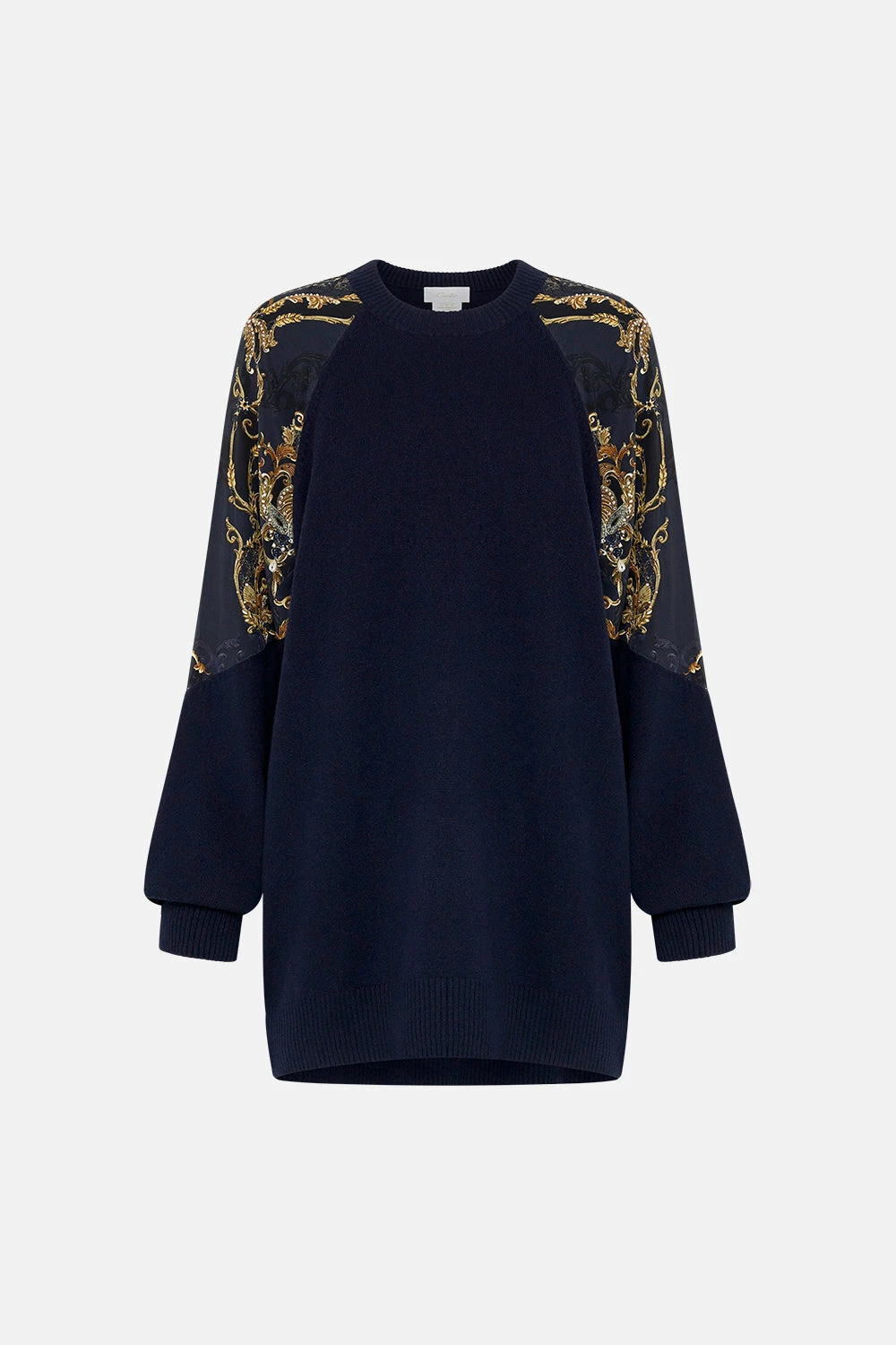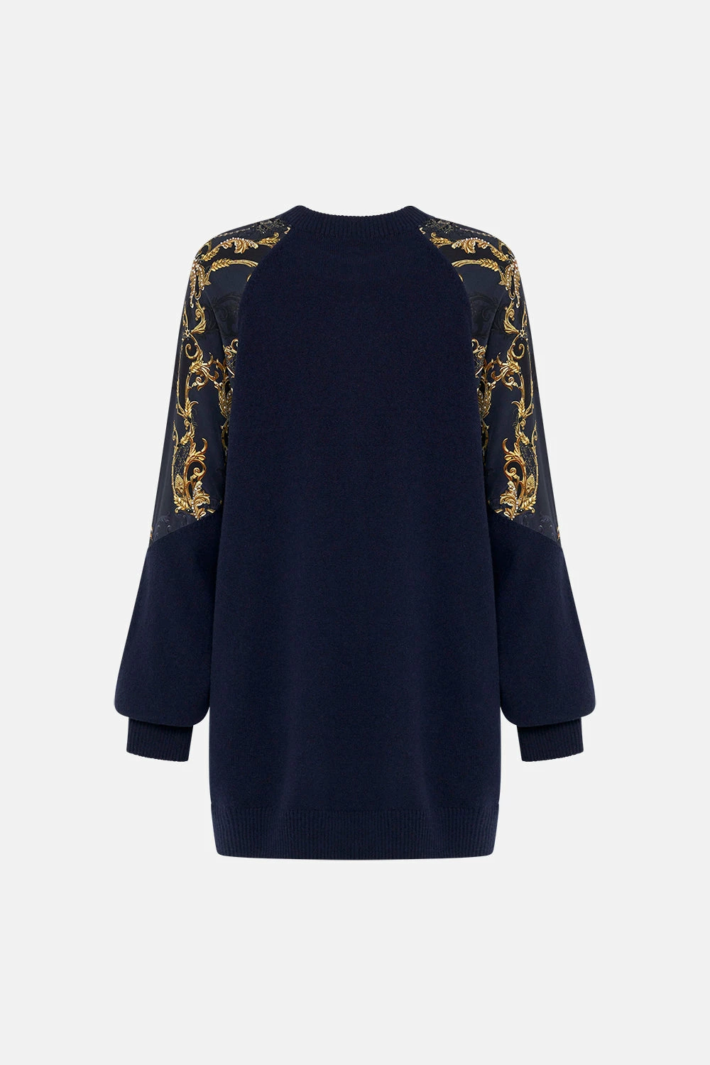 The Moonlight Melodies Silk Spliced Shoulder Jumper dips into an arrangement of gold and deep ebony flourishes highlighted with chains, pearls and diamond motifs. This luxury merino wool-cashmere blend jumper plays host to a classic crew neckline, a relaxed fit silhouette, contrast printed silk shoulder details and full length subtle blouson sleeves. Lovingly handcrafted and designed in Australia, explore more from The Moral Of The Story: Act II collection.