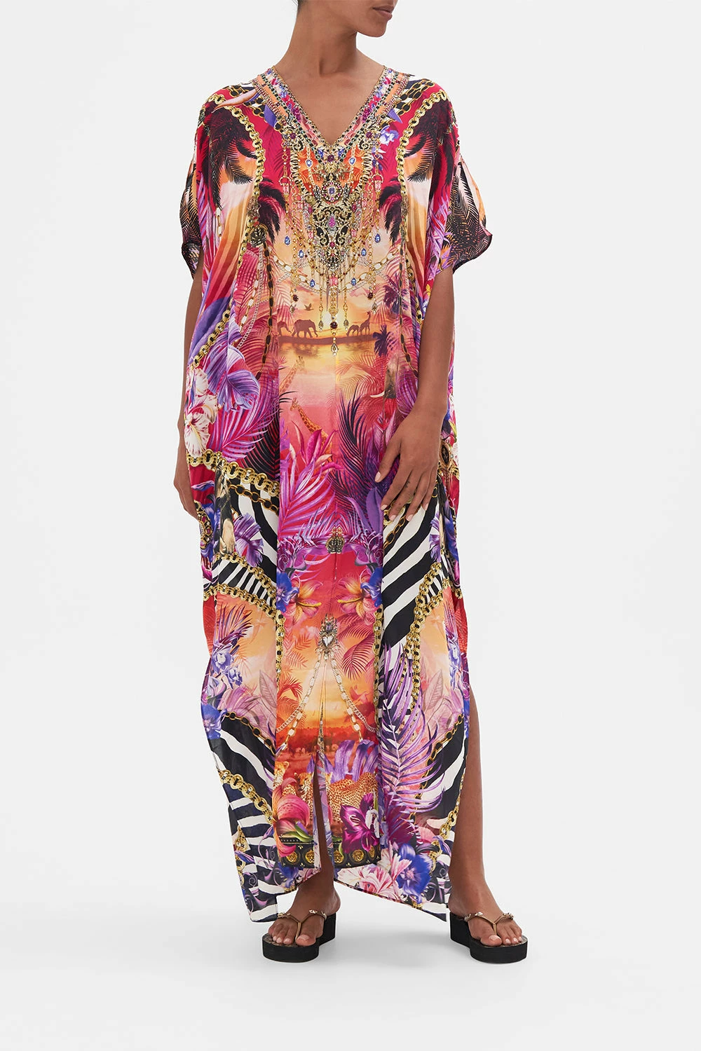 The Wild Loving Slim Fit Kaftan With Split radiates the warm glow of a sunset paradise. Where wilderness reigns amongst vibrant violet florals nestling against bold magenta palms, laced with intricate gold chains, charms and hints of sparkling amethyst jewels. Hand-embellished with CAMILLA crystals, this luxury silk kaftan is home to a classic v neckline, cropped sleeves and a relaxed slim fit maxi silhouette with split in sleeves and centre front split for subtle a glimpse of leg at every stride. Lovingly handcrafted and designed in Australia, explore more from The Moral Of The Story: Act II collection.